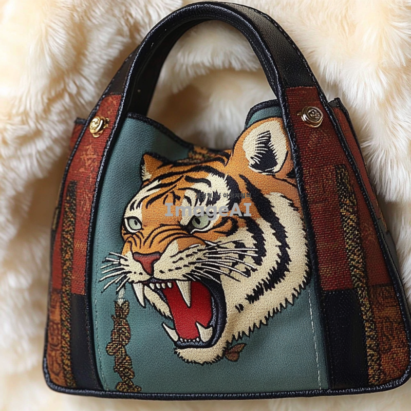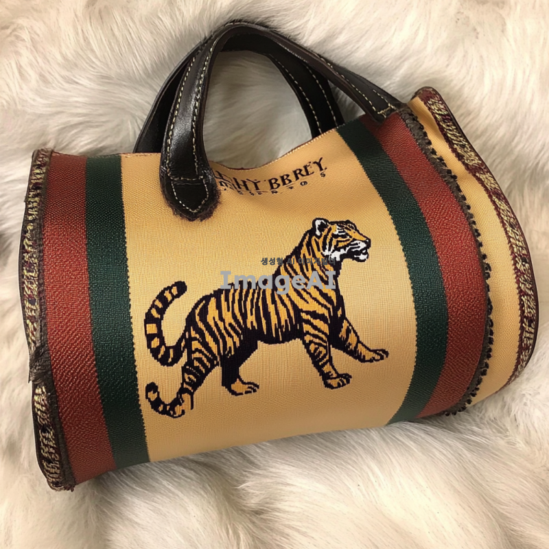 버버리의 패턴을 토대로 구찌의 대표 동물인 호랑이 자수와 대표 색상을 포인트로 넣어 버버리의 1960년대의 빈티지함과 현대의 세련됨과 트랜디함을 강조하여 사실적이고 실제로 판매되는 것처럼 만들어줘