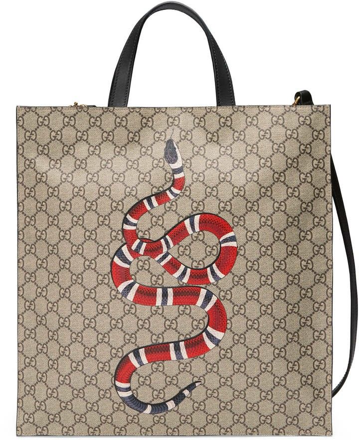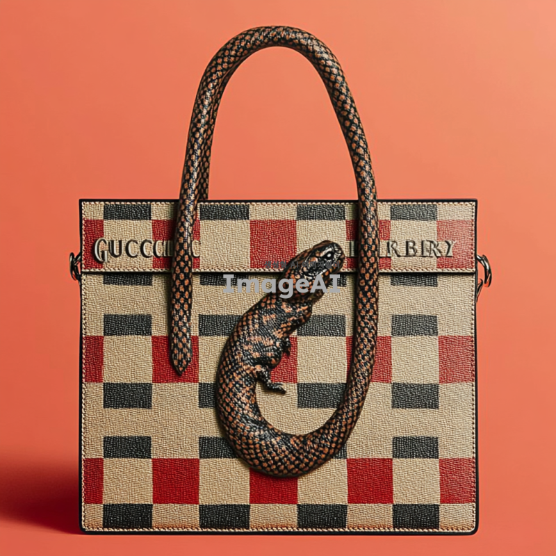 구찌 패턴의 뱀이 중앙에 배치된 핸드백 디자인, 배경에는 버버리의 체크 무늬가 조화롭게 어우러진 모습. 사실적이고 세련된 스타일로, 실제 판매되는 제품처럼 고급스러운 느낌을 강조. 구찌와 버버리의 브랜드 아이덴티티가 잘 드러나도록 섬세한 디테일을 포함.