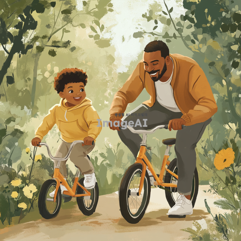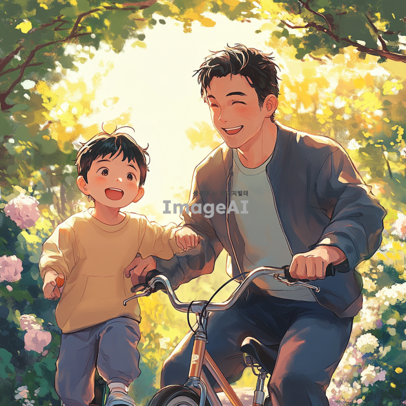 아빠와 아들이 함께 놀고 있는 모습, 공원에서 자전거를 타고 있는 장면, 따뜻한 햇살 아래 웃고 있는 모습, 아빠는 캐주얼한 옷을 입고 있고 아들은 귀여운 운동복을 입고 있음, 배경에는 푸른 나무와 꽃들이 있는 풍경, 행복한 가족의 순간을 포착한 이미지.