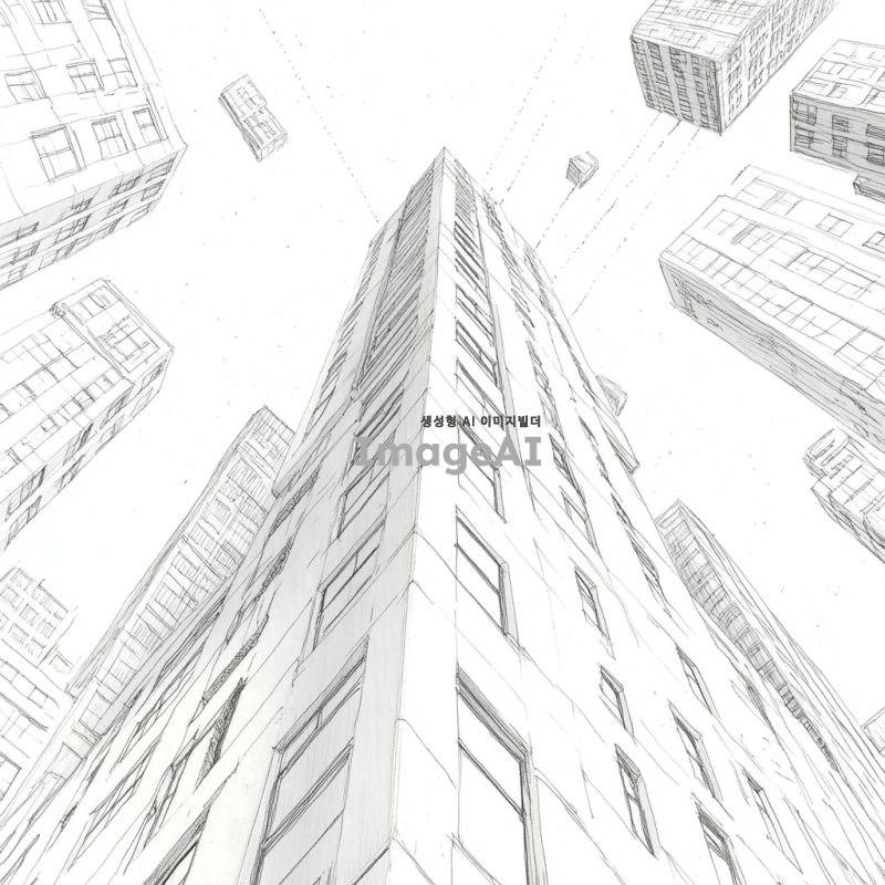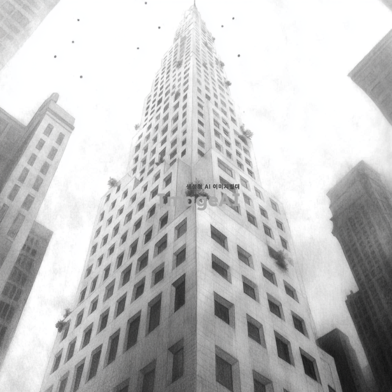 도시의 높은 한 건물을 점을 사용해서 위로 올라갈수록 점진적으로 그려줘
