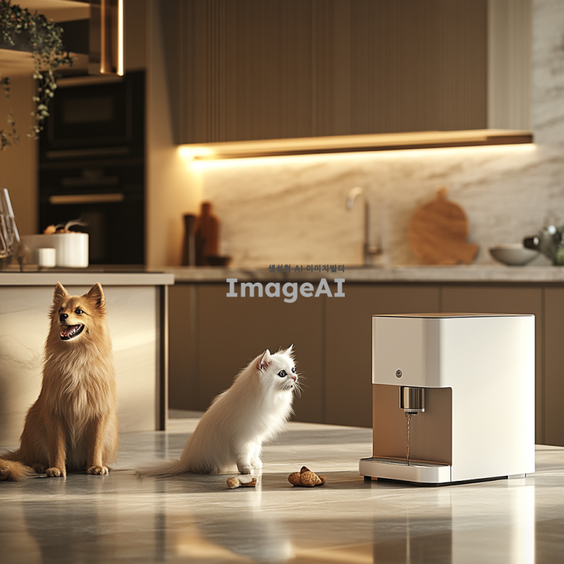 애완동물을 위한 초음파 감지 급수기가 있는 현대적인 주방 환경, 세련된 디자인의 급수기에서 물이 흐르고 있는 모습, 주변에 행복하게 노는 강아지와 고양이, 따뜻한 조명 아래 아늑한 분위기, 깨끗하고 정돈된 주방,