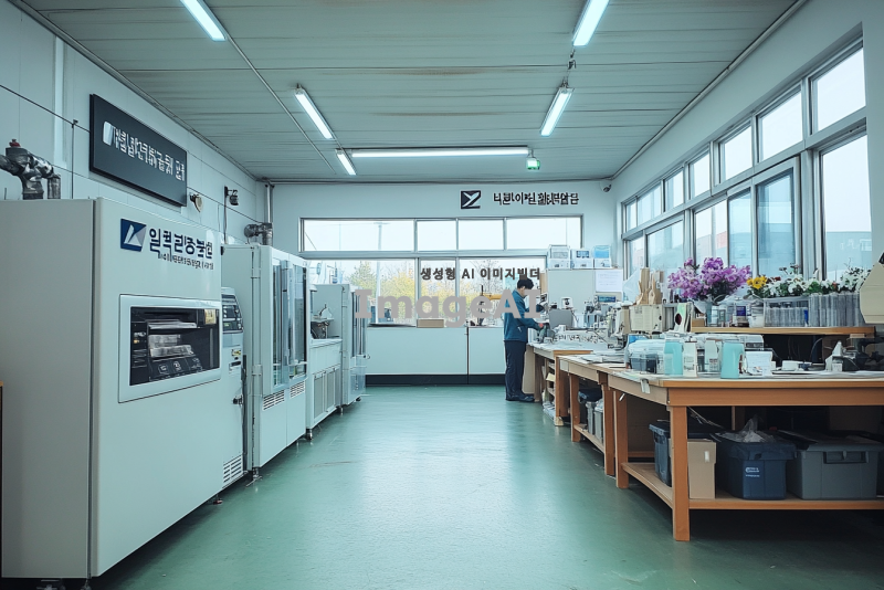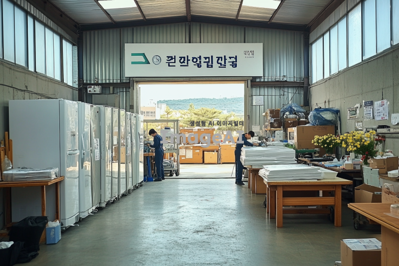 냉장고 장 리폼 공장 내부의 모습, 다양한 냉장고 모델들이 작업대에 놓여져 있고, 기술자들이 세심하게 작업을 하고 있는 장면, 현대적인 기계와 도구들이 배치된 작업 공간, 밝고 깔끔한 분위기, 효율적으로 진행되는 작업 프로세스, 한국의 전통적인 디자인 요소가 가미된 냉장고 리폼의 모습, 자연광이 들어오는 창문이 있는 공장 내부