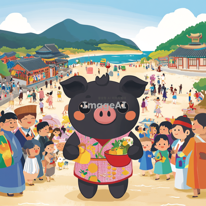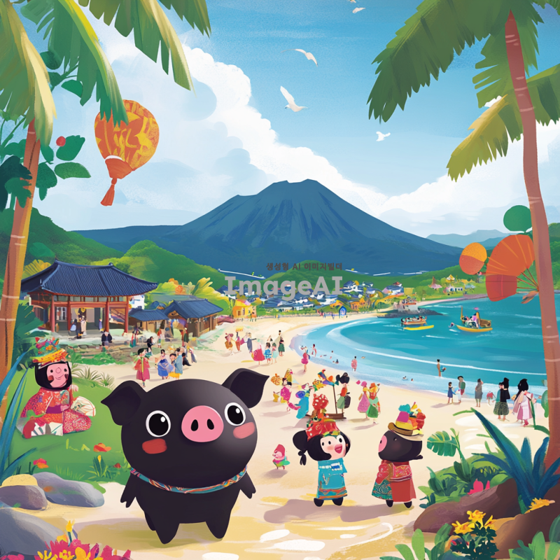 제주흑돼지를 글로벌 캐릭터로 표현한 이미지, 귀엽고 친근한 표정의 제주흑돼지가 세계 여러 나라의 전통 의상을 입고 다양한 문화 아이콘과 함께 있는 모습, 배경에는 제주도의 아름다운 자연 경관이 펼쳐져 있고, 해변과 한라산이 보이는 풍경, 따뜻한 햇살 아래에서 즐거운 분위기를 연출, 다양한 인종의 사람들과 함께 행복하게 어울리는 모습