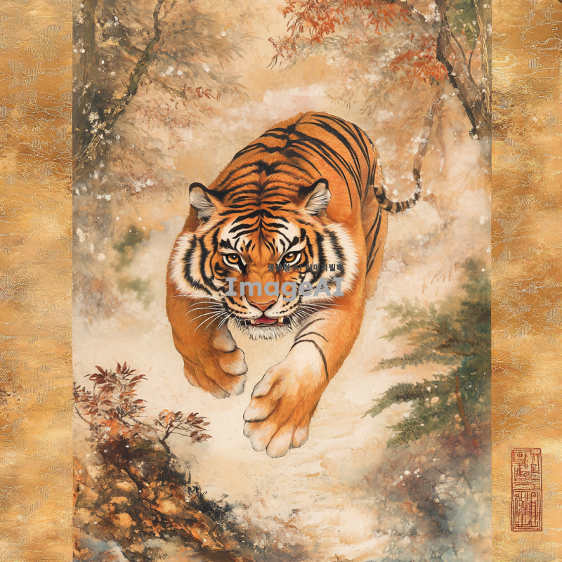 동양화 스타일의 호랑이, 전통적인 한국의 화풍으로 표현된 호랑이가 숲속에서 힘차게 뛰어오르는 모습, 생동감 넘치는 색채와 섬세한 붓 터치, 자연과 조화롭게 어우러진 배경, 고요한 분위기 속에서 강렬한 호랑이의 눈빛이 돋보이는 장면.