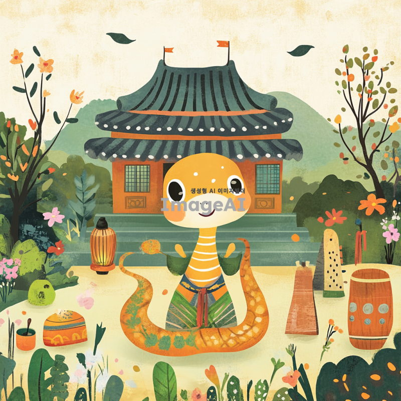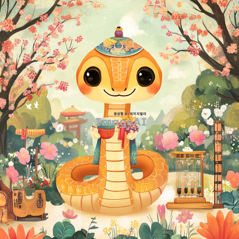 귀여운 뱀이 전통 한복을 입고 판소리를 하고 있는 모습, 뱀의 표정은 즐겁고 생동감 넘치며, 배경은 한국의 전통 정원으로, 아름다운 꽃들과 나무들이 어우러져 있는 장면. 뱀의 몸은 유려한 곡선으로 표현되고, 판소리의 전통 악기들이 주변에 배치되어 있는 모습.