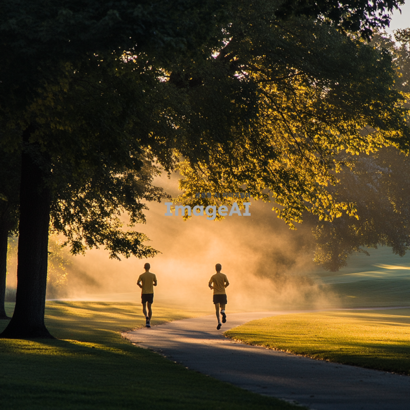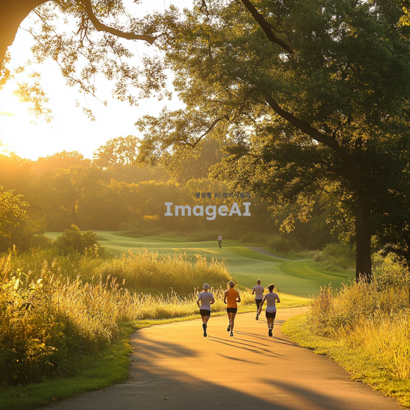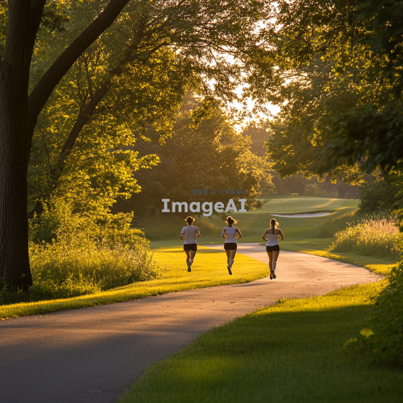 새벽에 라이트 조명을 받으면서 골프장 카트길을 달리는 사람들. 계절은 여름.