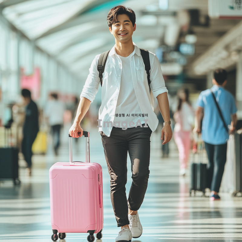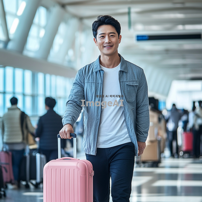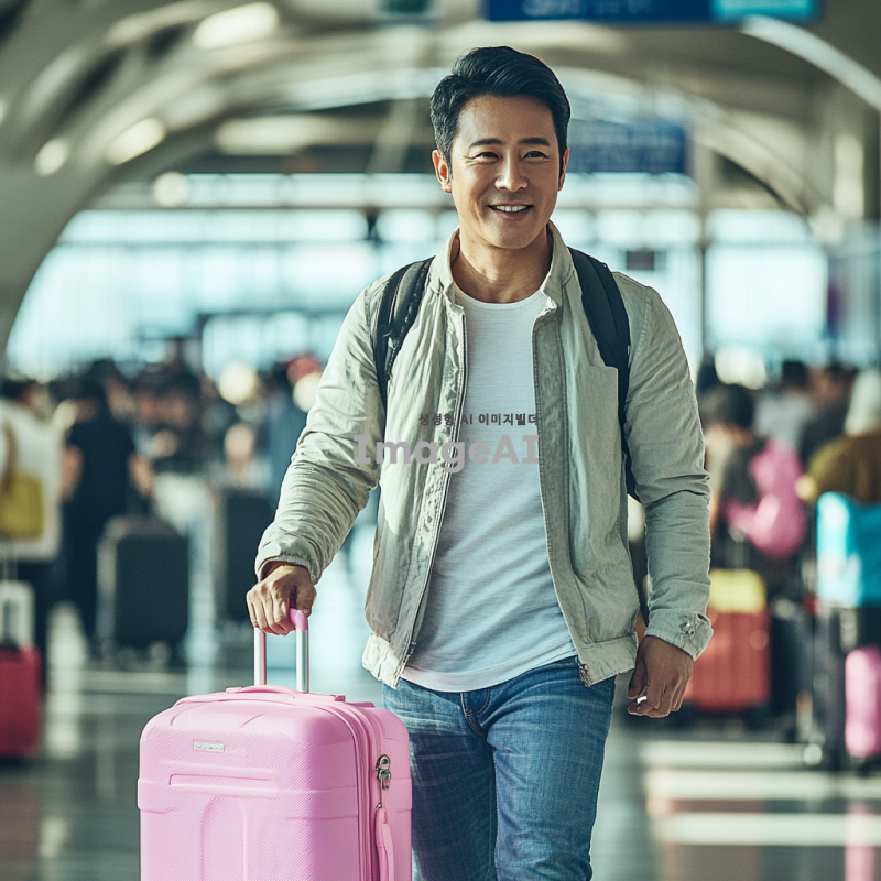 35살의 한국 남성이 핑크색 캐리어를 끌고 있는 모습. 남자는 캐주얼한 복장을 하고 있으며, 배경은 공항의 출발 구역. 주변에는 여행 가방과 사람들로 북적이는 분위기. 남자의 표정은 즐거워 보이며, 햇빛이 비치는 날씨.
