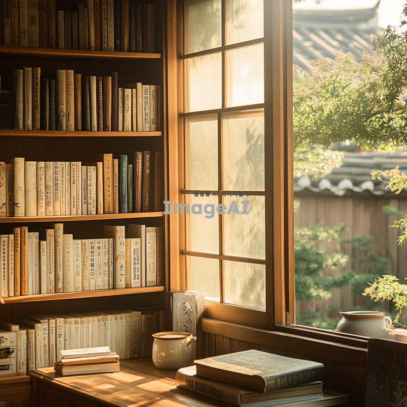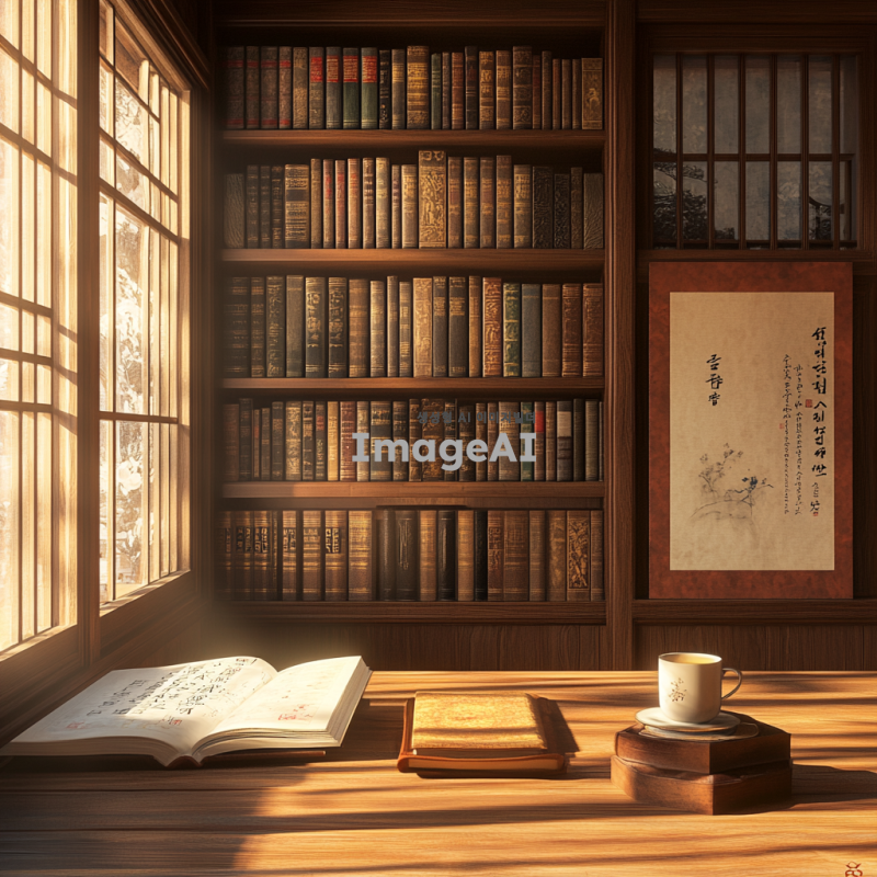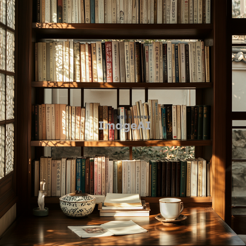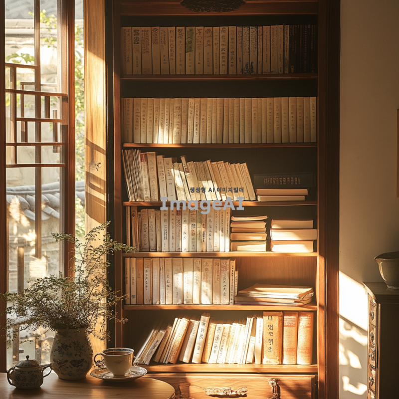 한국의 전통 서재에서 책이 가지런히 놓인 모습. 고풍스러운 책장과 따뜻한 조명이 어우러져 아늑한 분위기를 자아내며, 책 표지가 잘 보이도록 배치된 다양한 장르의 책들. 서재의 창문을 통해 부드러운 햇살이 들어오고, 책과 함께 차 한 잔이 놓여 있는 모습.