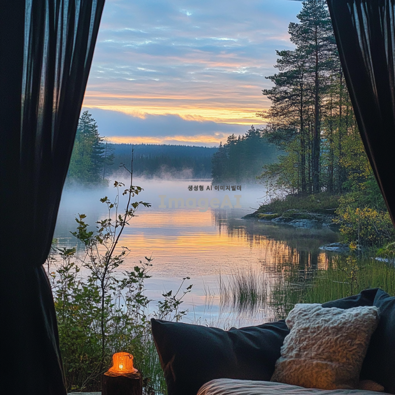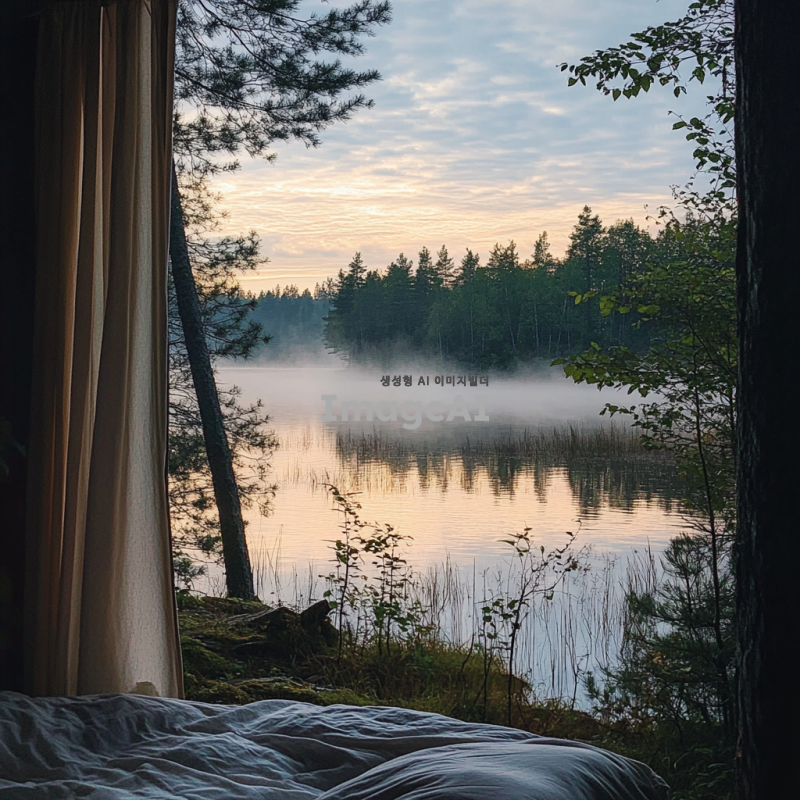 창문에 있는 커튼 너머로 호숫가가 보이고, 호숫가의 물이 아름답게 방안으로 흘러들어오는 모습을 지켜보고 있는 나의 모습. 방 안은 아늑하고 따뜻한 느낌을 주며, 자연의 아름다움과 평화롭고 몽환적인 분위기가 느껴지도록 해주세요.