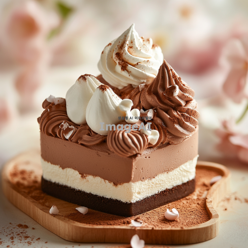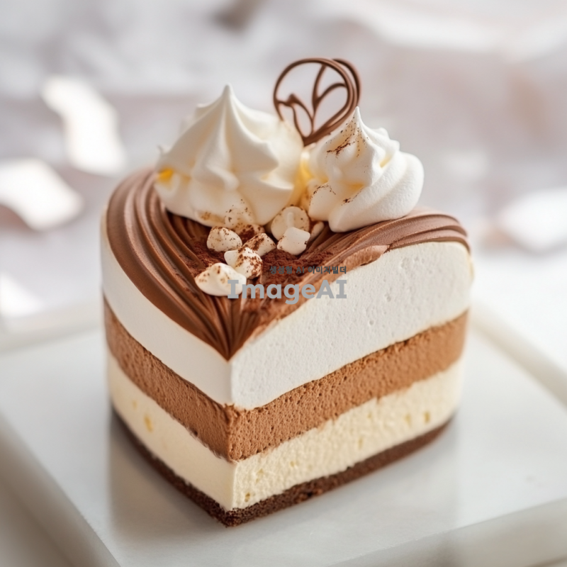 하트 모양의 무스케이크, 부드러운 머랭으로 장식되어 있으며, 초콜릿으로 세련되게 꾸며진 모습. 무스 위에는 작은 크기의 무스 하나가 더 올라가 있는 디저트. 배경은 밝고 아기자기한 느낌으로, 전체적으로 사랑스럽고 달콤한 분위기를 자아내는 이미지.