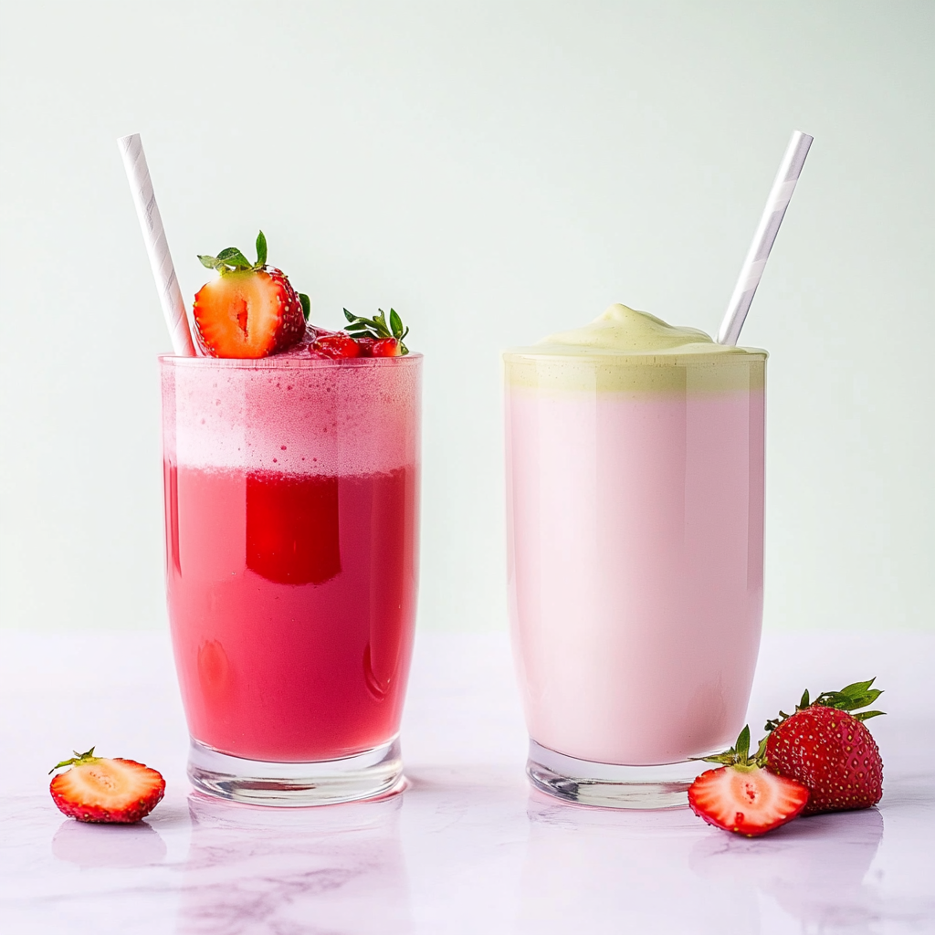 음료 두 잔의 사진, 하나는 딸기소스가 5분의1 깔려있고 그위에는 전부 바나나 우유가 채워져있다. 다른 하나는 분홍색 딸기 우유에 초록색 녹차크림이 부드럽게 얹어져있다. 흰색 배경 위에 놓여 있고, 딸기로 장식되어 있으며, 각 잔에 빨대가 꽂혀 있다. 연한 회색 단색 배경에서 정면에서 촬영되었고, 캐논 EOS 카메라로 자연광을 이용해 촬영되었다.