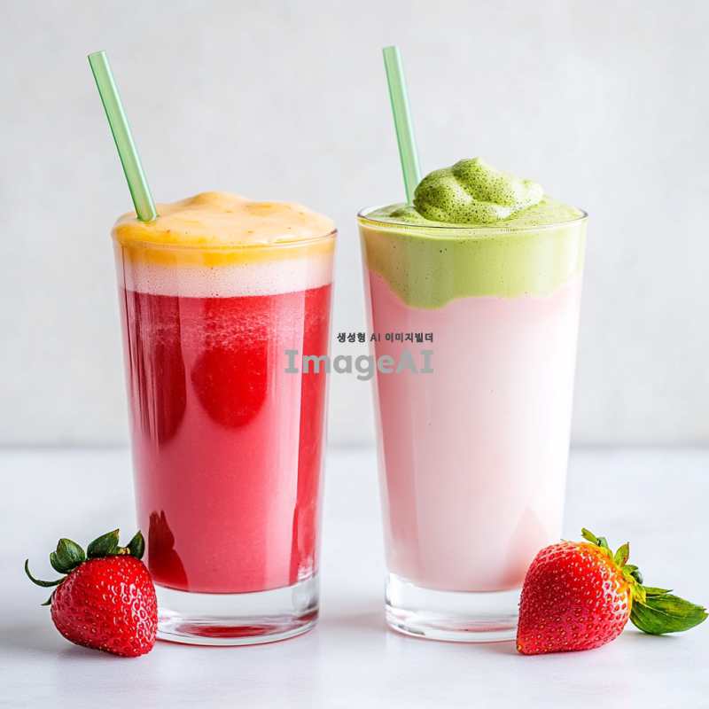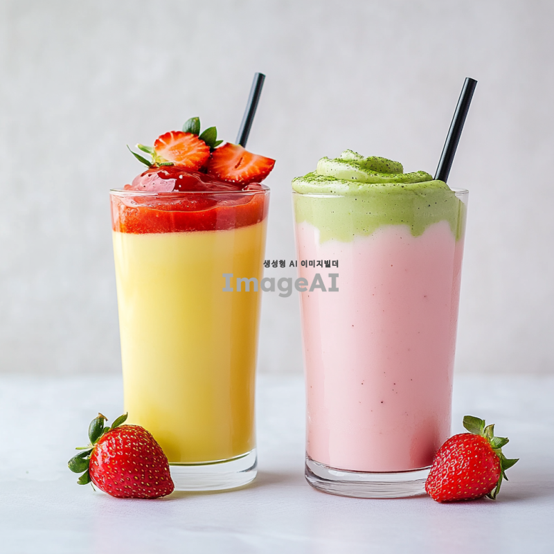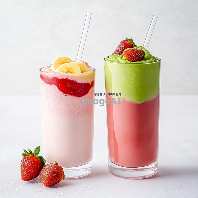 음료 두 잔의 사진, 하나는 딸기소스가 5분의1 깔려있고 그위에는 전부 샛노란 바나나 우유가 채워져있다. 다른 하나는 분홍색 딸기 우유에 초록색 녹차크림이 부드럽게 얹어져있다. 흰색 배경 위에 놓여 있고, 딸기로 장식되어 있으며, 연한 회색 단색 배경에서 정면에서 촬영되었고, 캐논 EOS 카메라로 자연광을 이용해 촬영되었다.
