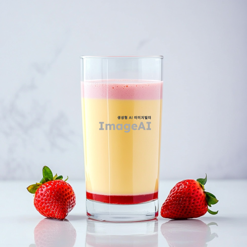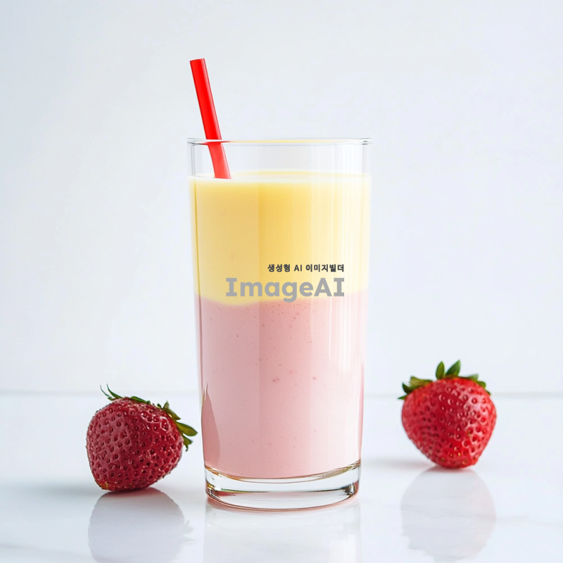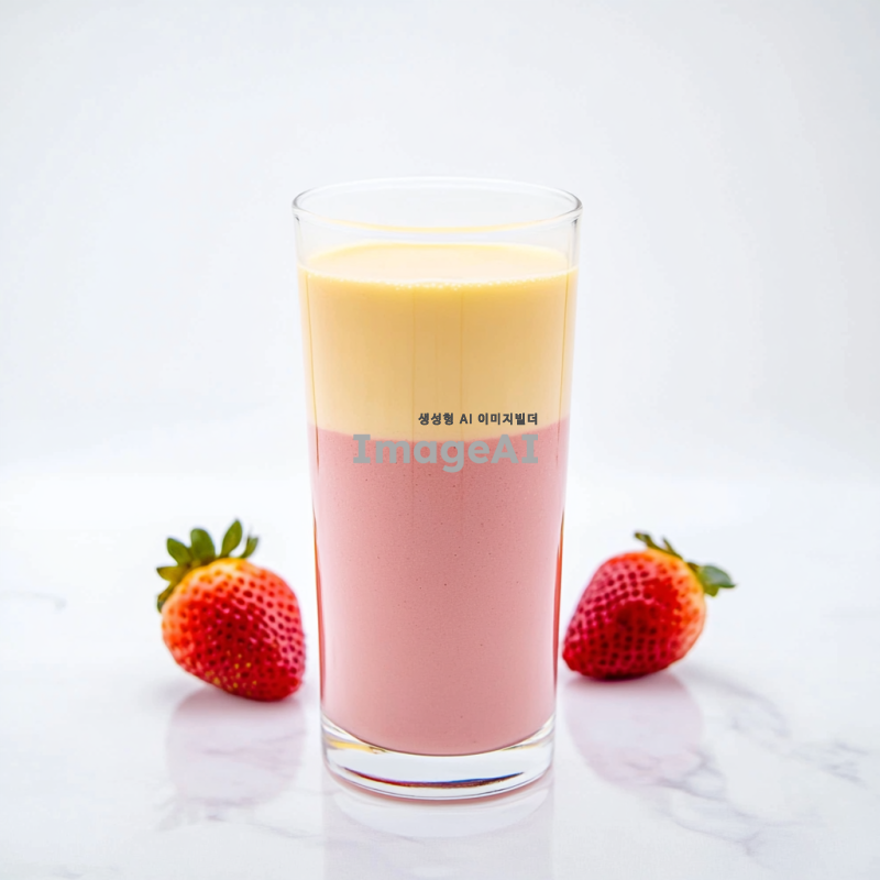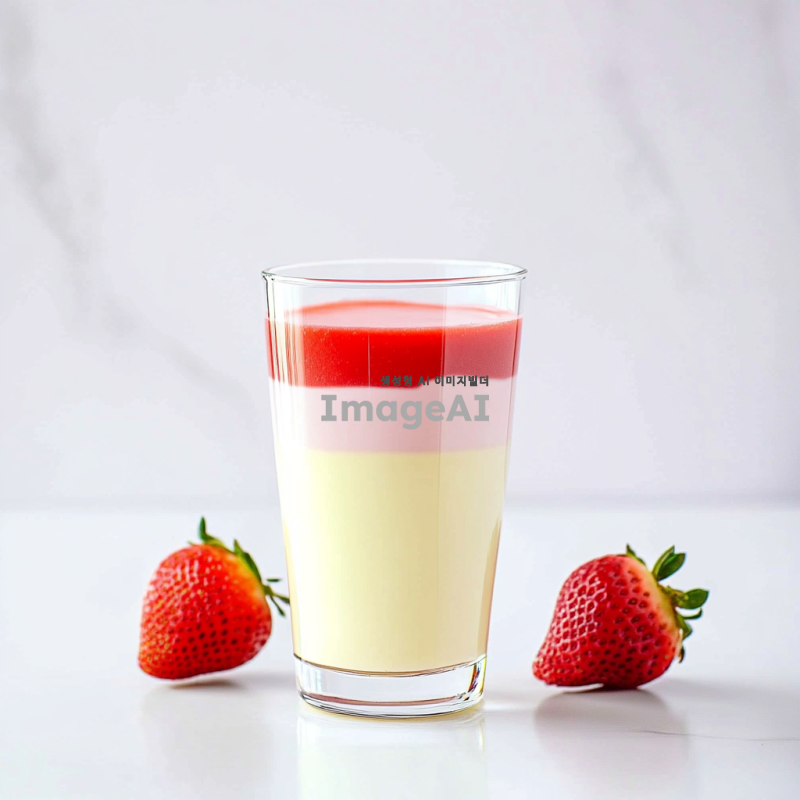 한개의 유리잔, 바닥에는 5분의1 정도의 딸기소스가 깔려있고, 5분의 4정도 샛노란 바나나 우유가 가득, 흰색 배경, 상업 사진, 밝은 색상, 클로즈업, 측면 뷰, 앞쪽 조명, 흰색 테이블 표면, 고해상도 사진.