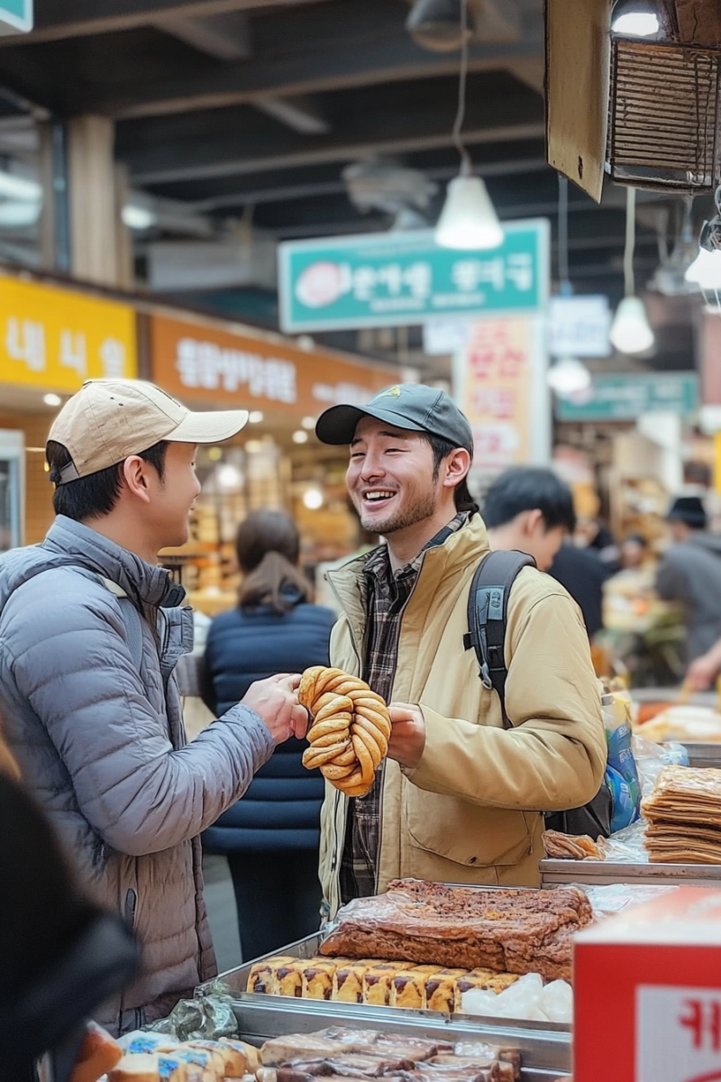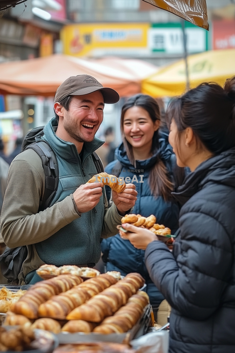 재래 시장에서 가벼운 등산복을 입고 있는 20대 서양 남성이 등산 모자를 쓰고 꽈배기를 먹고 있으며, 그 모습을 보며 밝게 웃고 있는 20대 동양 여성과 상인들과 이야기하는 40대 서양 부부가 함께 있는 장면.