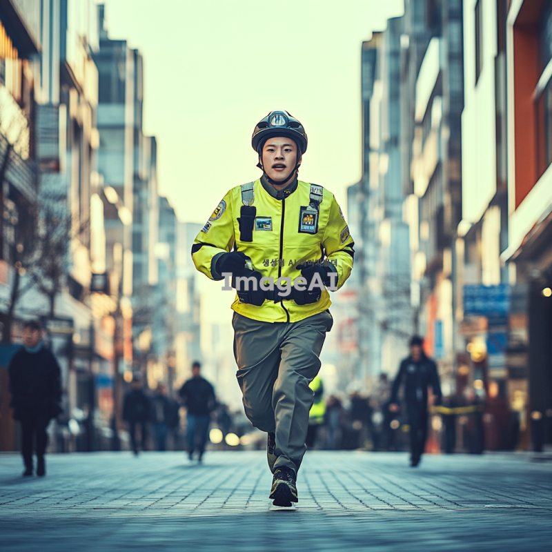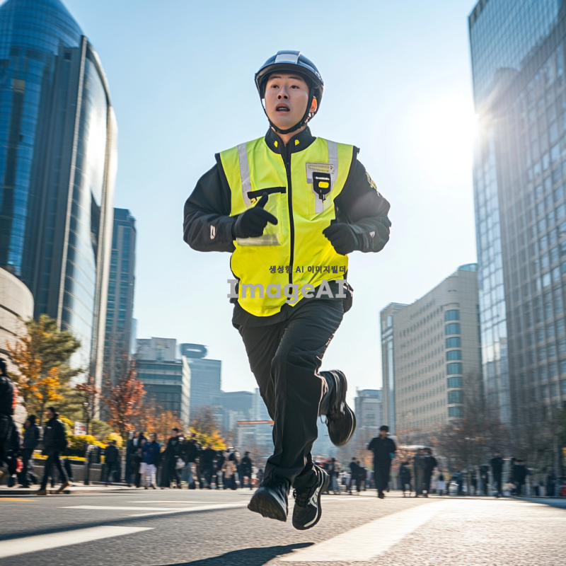 한국의 도시 거리에서 뛰고 있는 경비원, 밝은 유니폼을 입고 헬멧을 쓴 모습, 빠른 속도로 달리며 주변을 경계하는 표정, 배경에는 현대적인 건물과 사람들, 생동감 넘치는 분위기, 낮의 맑은 하늘 아래에서의 장면.