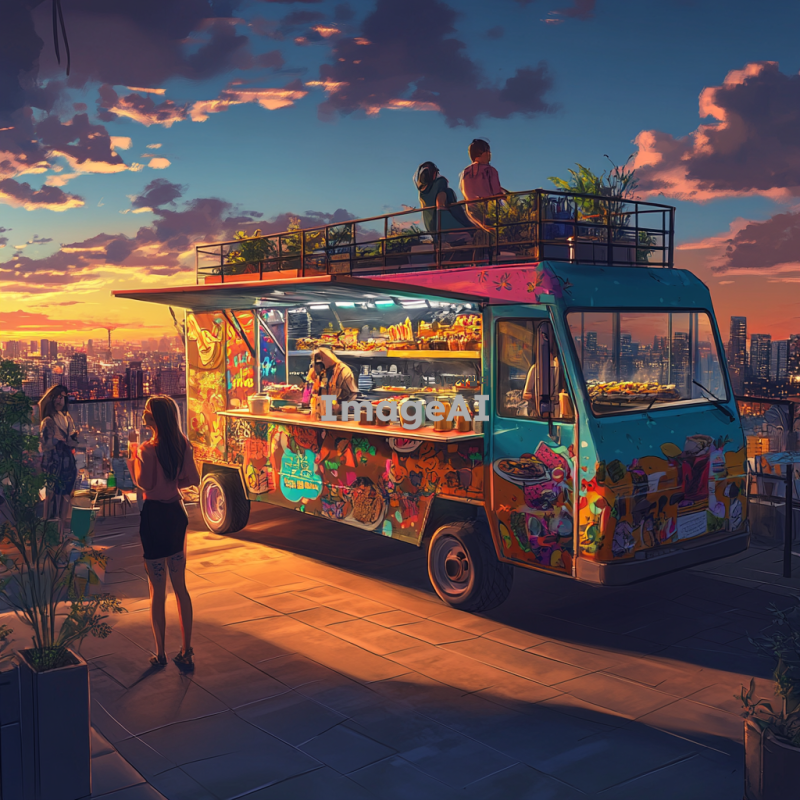 루프탑에 위치한 푸드트럭과 컨테이너의 풍경을 그려줘. 푸드트럭은 화려한 색상으로 장식되어 있으며, 다양한 음식을 판매하는 모습이 담겨 있다. 컨테이너는 현대적인 디자인으로, 주변에는 도시의 전경이 보인다. 해가 저물어가는 시간대의 따뜻한 빛이 분위기를 감싸고, 사람들이 푸드트럭 주변에서 즐거운 시간을 보내고 있는 장면을 포함해줘.