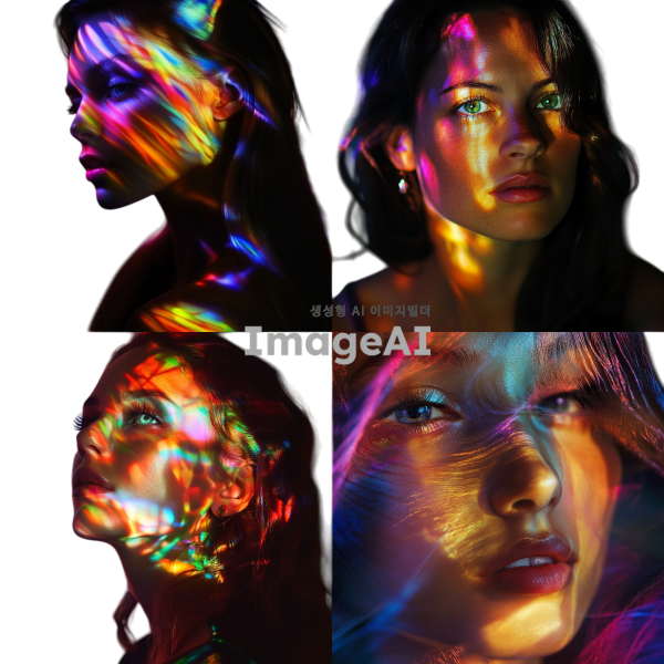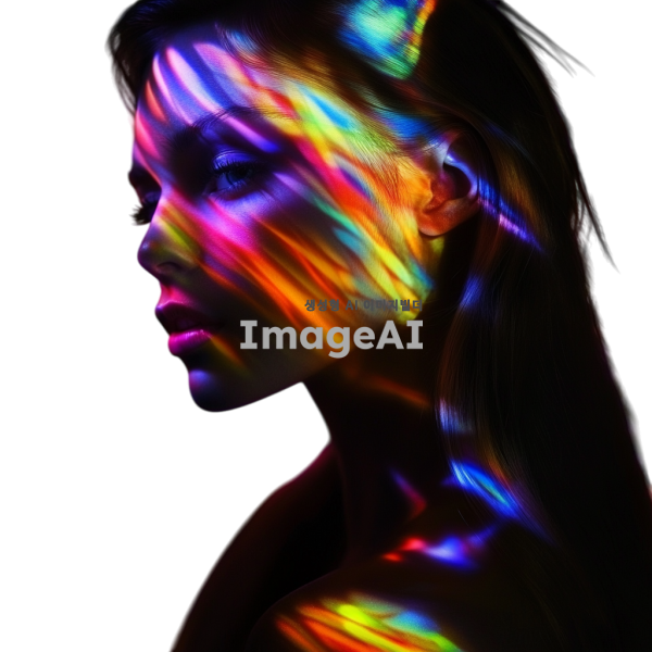 독특한 조명 아래에서 화려한 색감으로 아름답게 표현된 여성의 초상화, 창의적이고 예술적인 스타일, 다양한 색상의 빛이 어우러지는 장면, 환상적이고 매혹적인 분위기.