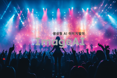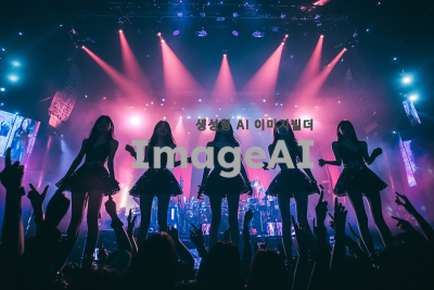 5인조 K-pop 걸그룹이 화려한 조명 아래에서 공연하는 모습, 환호하는 관객들의 실루엣이 배경에 어우러진 장면, 에너지 넘치는 분위기와 생동감 있는 색감으로 가득 찬 이미지