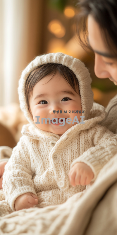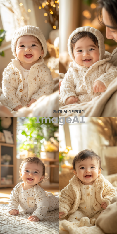 부드러운 파스텔 색상의 아기 의류를 입고 있는 아기가 행복하게 웃고 있는 모습, 따뜻한 자연광이 비치는 실내에서 놀고 있는 장면, 아기 의류의 세부 디자인이 잘 보이도록 촬영된 사진, 아기와 부모가 함께하는 따뜻한 순간을 담은 이미지.