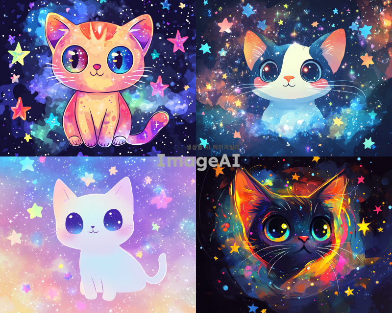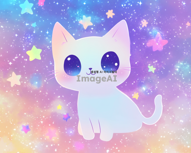 우주 고양이별에서 내려온 릴리라는 이름의 귀여운 고양이를 그려줘. 릴리는 반짝이는 별과 은하수 배경 속에서 신비로운 분위기를 풍기고, 큰 눈과 귀여운 표정으로 사랑스럽게 표현되어야 해. 다양한 우주 장식과 함께, 색색의 별들이 주위를 감싸고 있는 모습으로 그려줘.