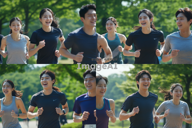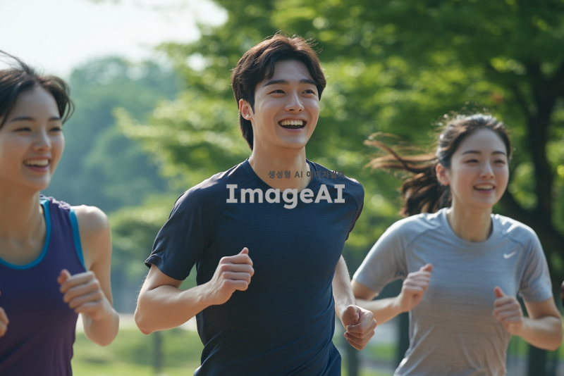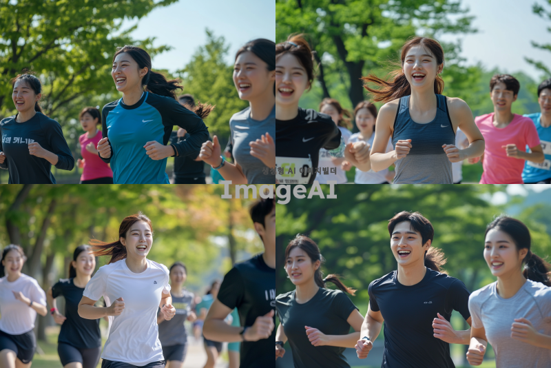 활기찬 공원에서 여러 사람이 함께 달리는 모습, 한국인이며 다양한 성별의 사람들이 웃으며 대화하며 달리고 있는 장면, 푸른 나무와 화창한 하늘, 에너지가 넘치는 분위기, 운동복을 입고 있는 사람들, 서로를 격려하며 즐겁게 달리는 모습