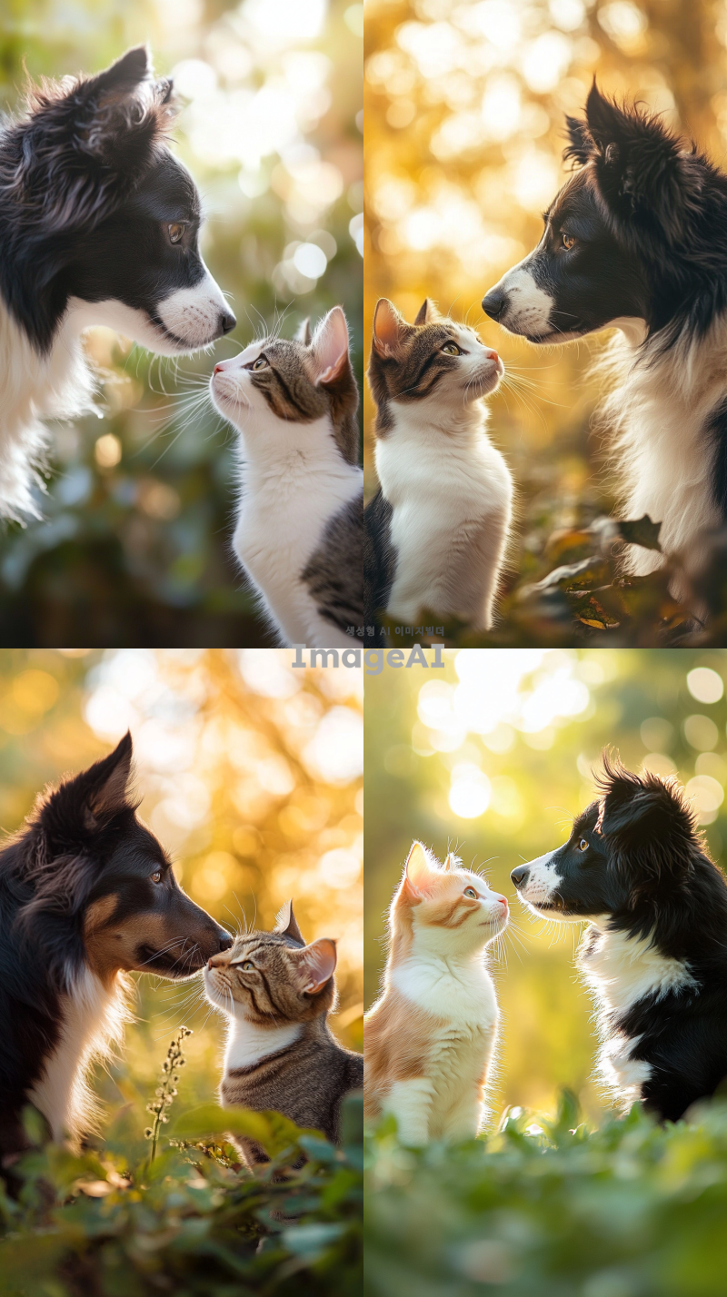 어린 보더콜리와 품종이 있는 고양이가 친하게 지내는 매우 귀여운 사진을 만들고싶어.