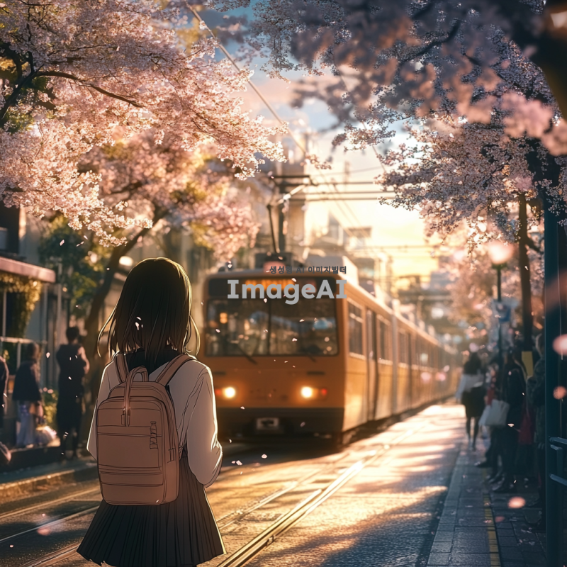 감성적인 일본의 거리 풍경, 전차가 지나가는 모습, 전형적인 일본 여고생의 뒷모습이 보이는 장면, 애니메이션에서 영감을 받은 따뜻하고 아기자기한 분위기, 벚꽃이 만개한 나무와 함께 조화롭게 어우러진 거리 풍경, 부드러운 색감과 몽환적인 조명이 있는 이미지.