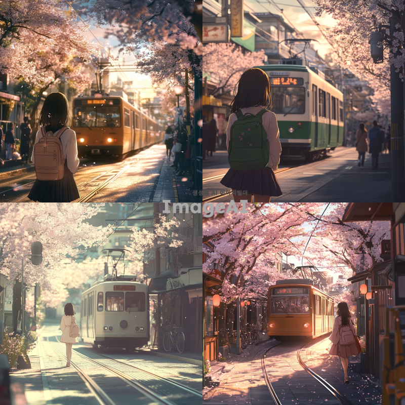 일본여행상품을 팔려고 하는데 감성적인 일본의 거리 사진을 만들어줘.전차도 있으면 좋겠고~ 전형적인 일본 여고생의 뒷모습도 보이고 애니메이션에서 나올것 같은 감성적 거리