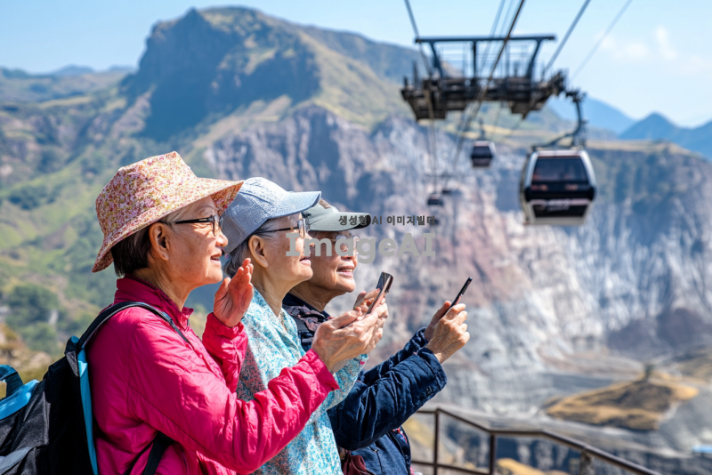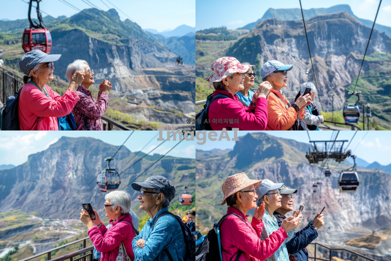 중국의 험한 화산을 배경으로 노인들이 즐겁게 관광하는 모습. 화산의 경치가 아름답고, 케이블카와 출렁다리가 잘 보이도록 배치. 노인들은 활기차고 행복한 표정으로 서로 대화하며 사진을 찍거나 주변 경치를 감상하는 모습. 화산의 경사와 독특한 지형이 드러나도록, 맑은 날씨 속에서 자연의 아름다움이 강조된 장면.