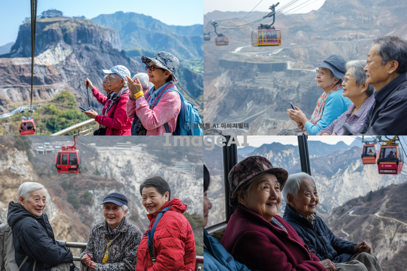 중국 화산이라는 험한산에 노인들이 관광을 간 모습의 사진을 만들어줘. 노인들이 잘 노는 것 같이 보여야 함. 화산에 보면 케이블카도 있고 출렁다리도 있고 그러잔항.