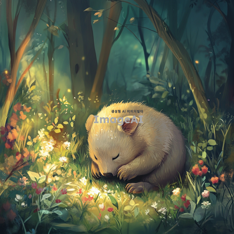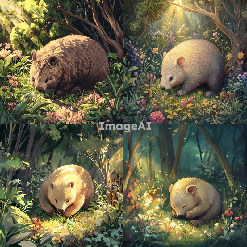 웜뱃이 자연 속에서 평화롭게 풀을 뜯고 있는 모습, 주변에는 다양한 식물과 나무가 어우러져 있는 풍경, 햇살이 부드럽게 비추는 따뜻한 느낌의 장면, 웜뱃의 털이 빛나는 모습과 귀여운 표정 강조, 자연의 소리와 함께하는 조화로운 환경.