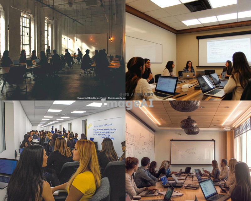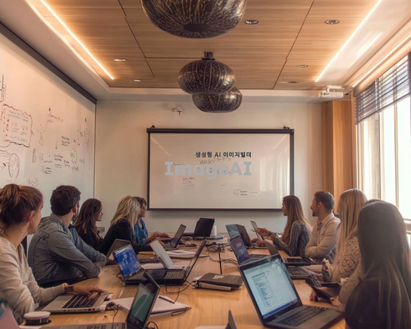 비즈니스 회의 중인 다양한 인종의 사람들이 모여 있는 현대적인 사무실 공간, 노트북과 화이트보드가 있는 배경, 진지하게 토론하는 모습, 전문적인 분위기, 조명이 밝고 쾌적한 환경.