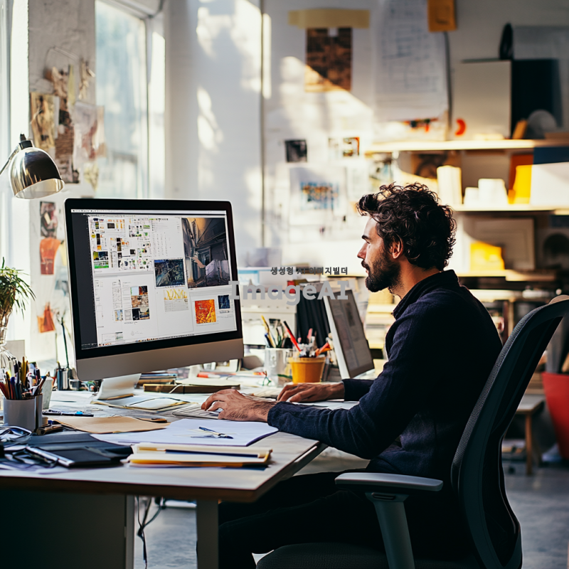 디자이너가 컴퓨터 앞에서 집중하여 작업하는 모습, 다양한 디자인 소프트웨어가 열려 있는 화면, 조명이 밝고 현대적인 사무실 환경, 편안한 의자에 앉아 있는 디자이너, 창의적인 아이디어를 스케치하는 모습, 주변에 디자인 도구와 참고 자료가 흩어져 있는 모습, 열정적으로 일하는 표정, 디지털 아트 작업에 몰두하는 분위기.
