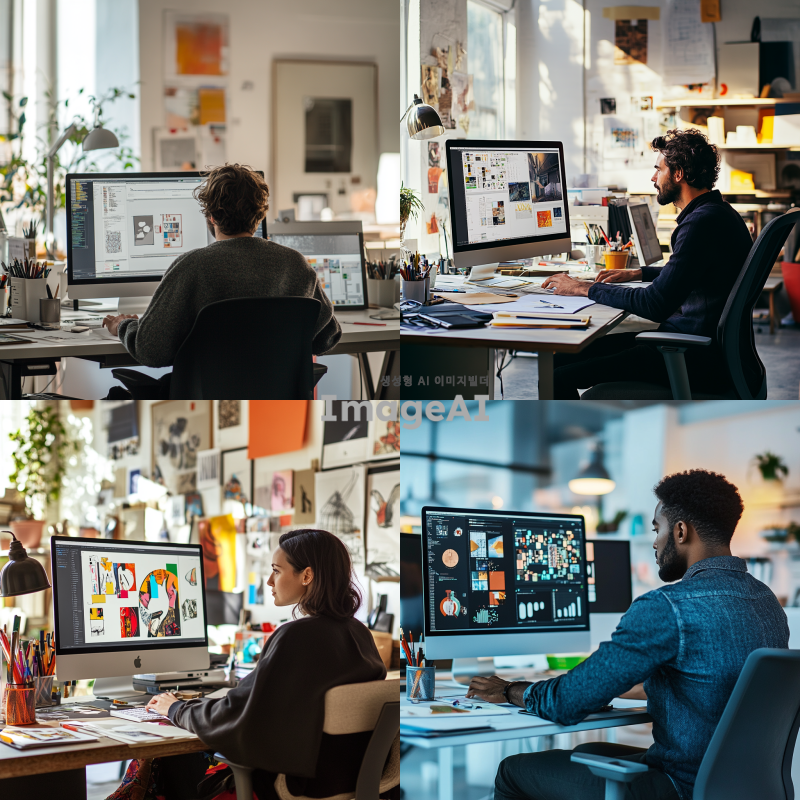 디자이너가 컴퓨터 앞에서 열심히 작업하는 모습을 만들어 주고 싶어.