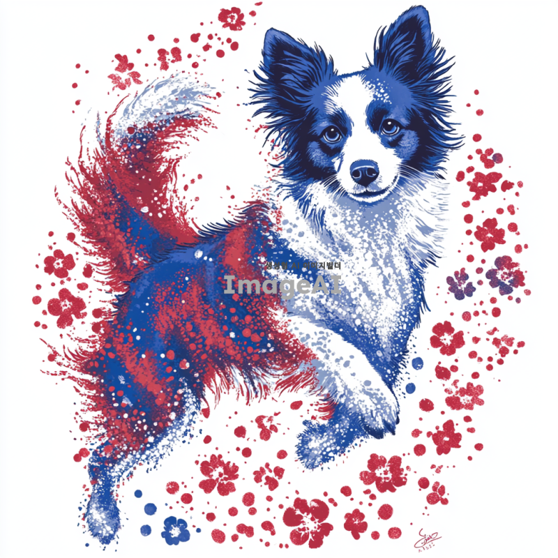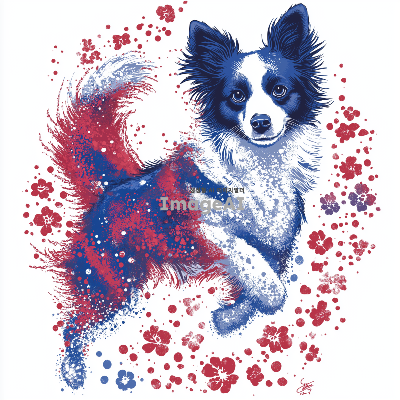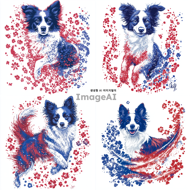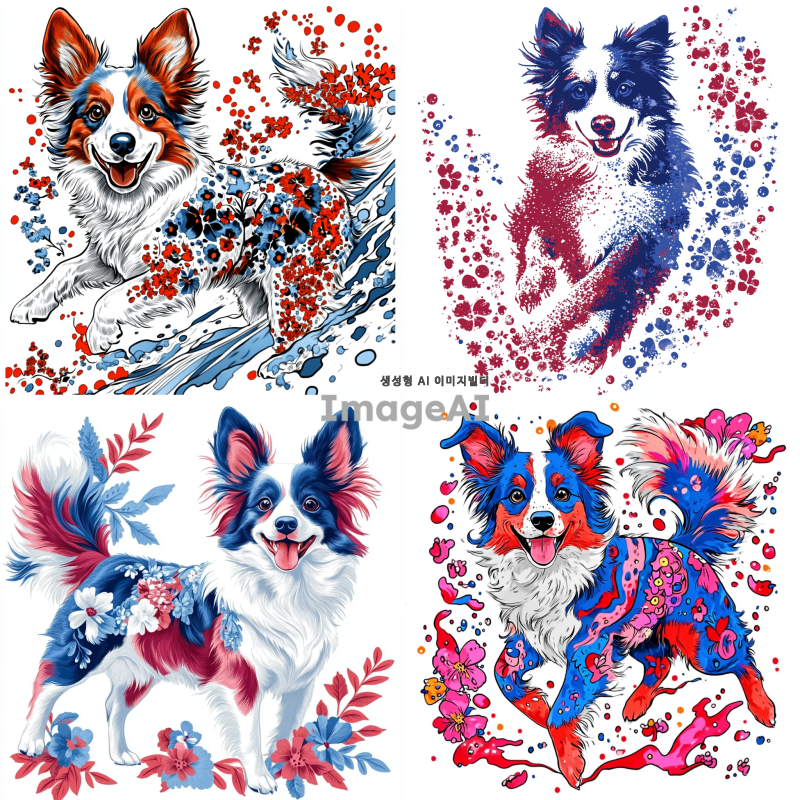 보더콜리를 중심으로 한 화려하고 예쁜 티셔츠 디자인, 다양한 색상의 꽃과 패턴으로 장식된 보더콜리, 흰색 배경 위에 생동감 있게 표현된 모습, 귀여운 표정과 역동적인 포즈, 아트 스타일은 현대적이고 세련되며, 밝고 경쾌한 느낌을 주는 디자인.