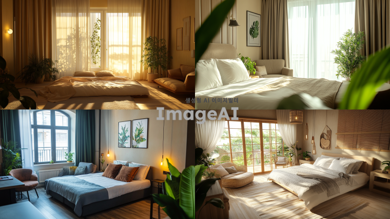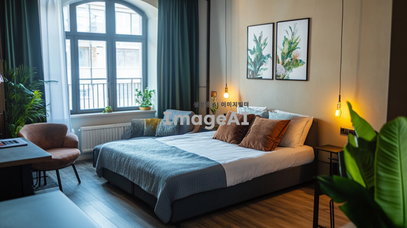 아늑하고 현대적인 인테리어의 방, 밝은 자연광이 들어오는 큰 창문, 따뜻한 색조의 벽과 편안한 가구들, 세련된 장식과 식물이 어우러진 공간, 깔끔하고 정돈된 분위기, 부드러운 텍스처의 침대와 아늑한 소파, 현대적인 디자인의 조명, 전체적으로 편안하고 환영하는 느낌의 방.
