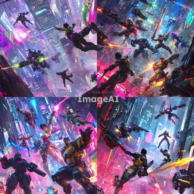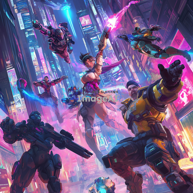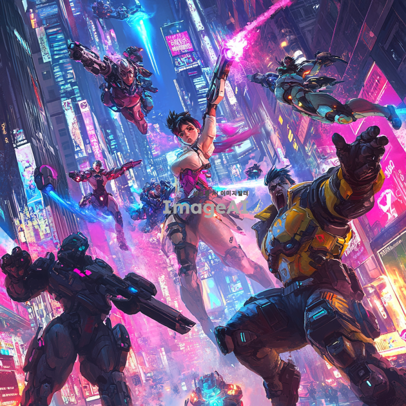 오버워치의 한 장면을 재현한 이미지, 다양한 영웅들이 전투 중인 모습, 화려한 스킬 이펙트와 역동적인 배경, 미래적인 도시 풍경, 강렬한 색채와 생동감 넘치는 캐릭터들, 팀워크와 전략이 느껴지는 긴장감 있는 순간, 각 영웅의 특징적인 의상과 무기, 전투의 열기를 표현한 장면.