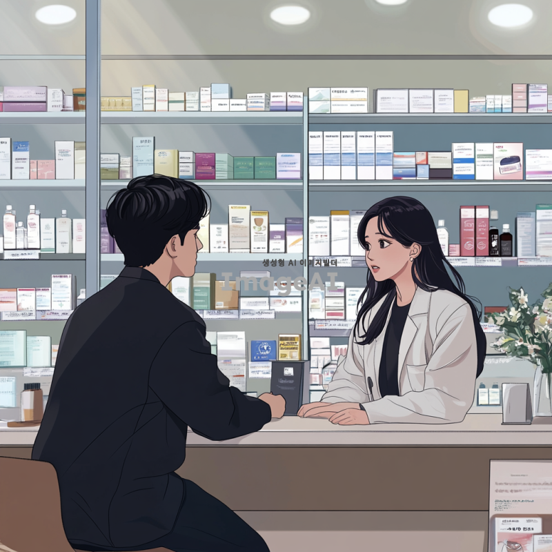 한국의 약국 내부에서 상담을 진행하는 친절한 한국인 약사의 모습, 약사가 환자의 질문에 귀 기울이며 상담하는 장면, 약사 옆에는 다양한 약품과 건강 관련 서적이 진열된 모습, 따뜻한 조명 아래 편안한 분위기, 약사는 깔끔한 약사복을 입고 있으며, 환자는 진지한 표정으로 약사와 대화하고 있는 모습.