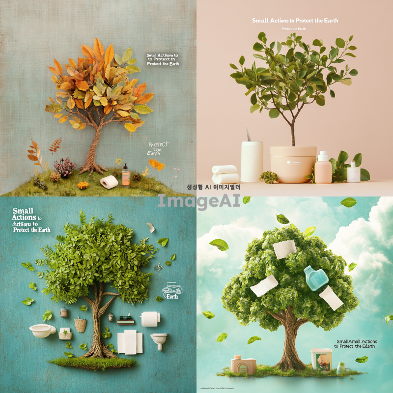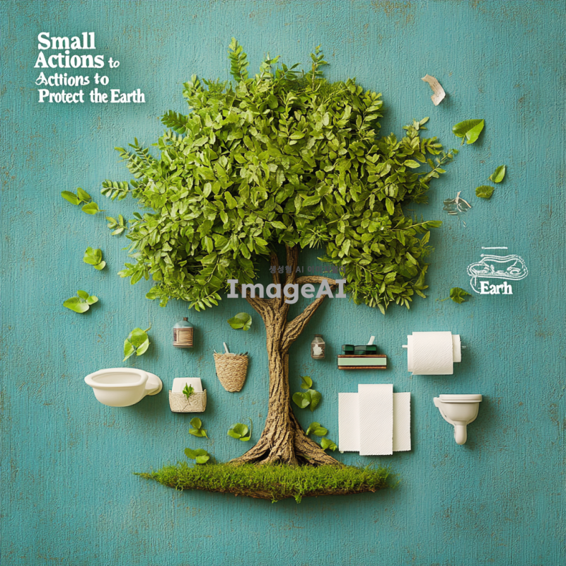 아름다운 자연 배경 속에서 나무가 자라는 모습을 담고, 그 주변에 화장지 대신 사용할 수 있는 대체품들이 자연스럽게 배치된 장면을 표현해 주세요. 나무의 건강한 잎사귀와 함께 "지구를 지키는 작은 실천"이라는 문구가 부드럽게 나타나도록 구성해 주세요. 따뜻한 색감으로 친환경적인 느낌을 강조하며, 사람들의 일상 속에서 화장지를 아껴 쓰는 모습이 자연스럽게 녹아들도록 해주세요.