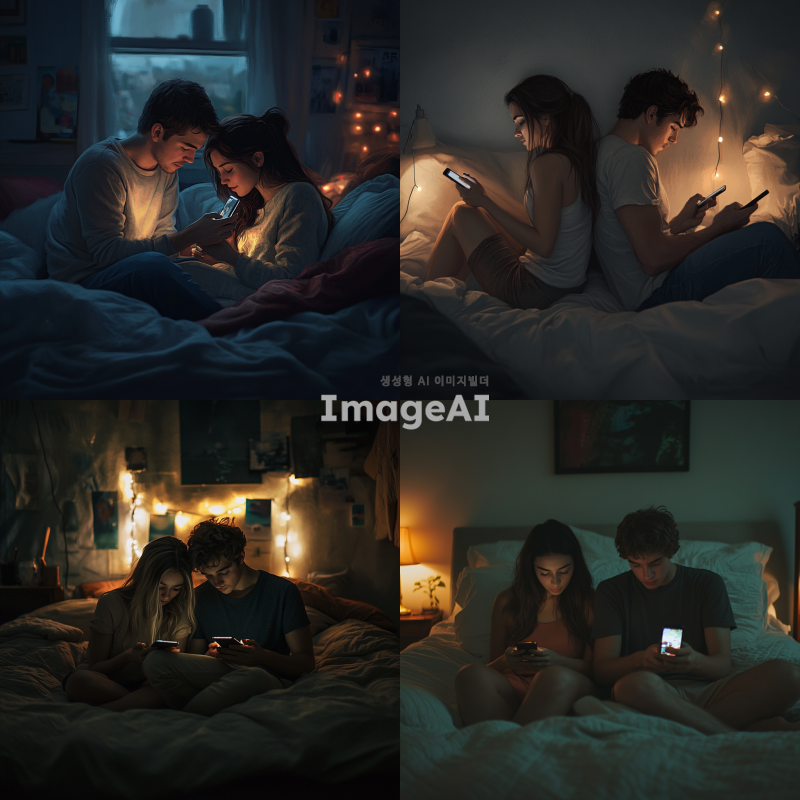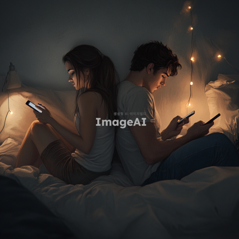 어두운 방 안에서 침대에 앉아 서로 등을 지고 있는 예쁘고 잘생긴 남녀의 모습. 두 사람은 각자 핸드폰을 들고 집중하고 있으며, 핸드폰의 조명만이 주변을 비추고 있는 실사에 가까운 장면. 침대의 부드러운 침구와 함께 아늑한 분위기를 연출하며, 핸드폰의 빛이 얼굴에 드리워져 있는 모습.