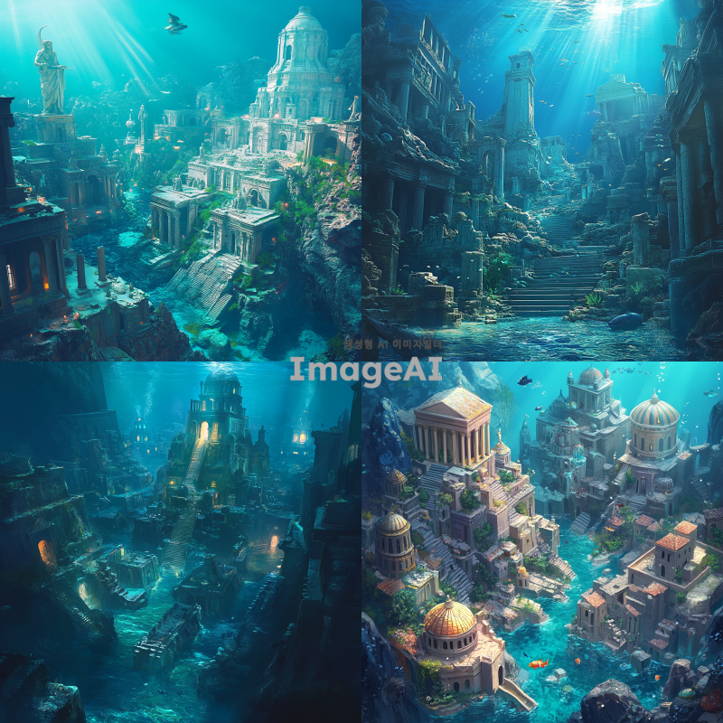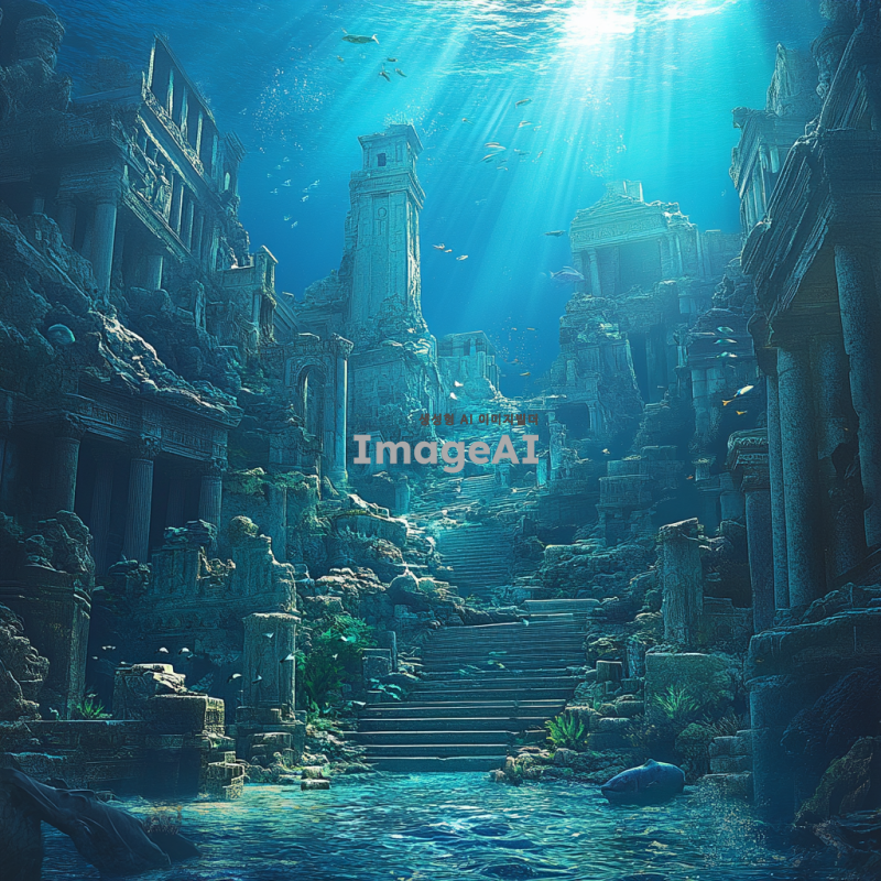 바다 깊숙이 가라앉은 전설의 고대 도시, 신비로운 해양 생물들이 서식하는 아름다운 수중 풍경, 고대 건축물과 조각상들이 해양 생물에 의해 덮여 있는 모습, 푸른빛의 물속에서 빛나는 보물과 유물들, 신비로운 분위기의 수중 탐험가들이 도시를 탐방하는 장면, 몽환적인 조명과 화려한 색감이 어우러진 신비로운 바닷속 풍경.