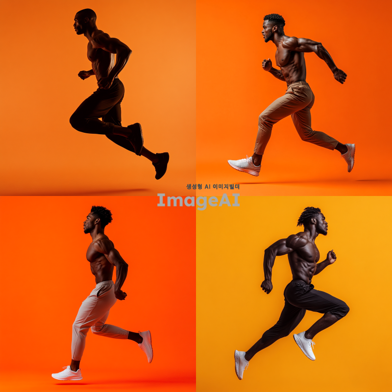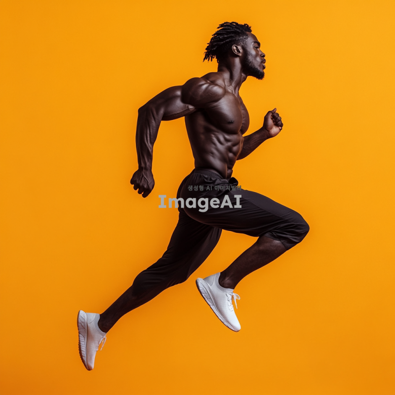 오렌지색 배경에서 근육질의 날씬한 흑인이 바지와 운동화를 입고 달려 나가는 모습, 공중에서 옆 모습을 강조하여 역동적인 자세와 힘찬 운동감을 표현해주세요.