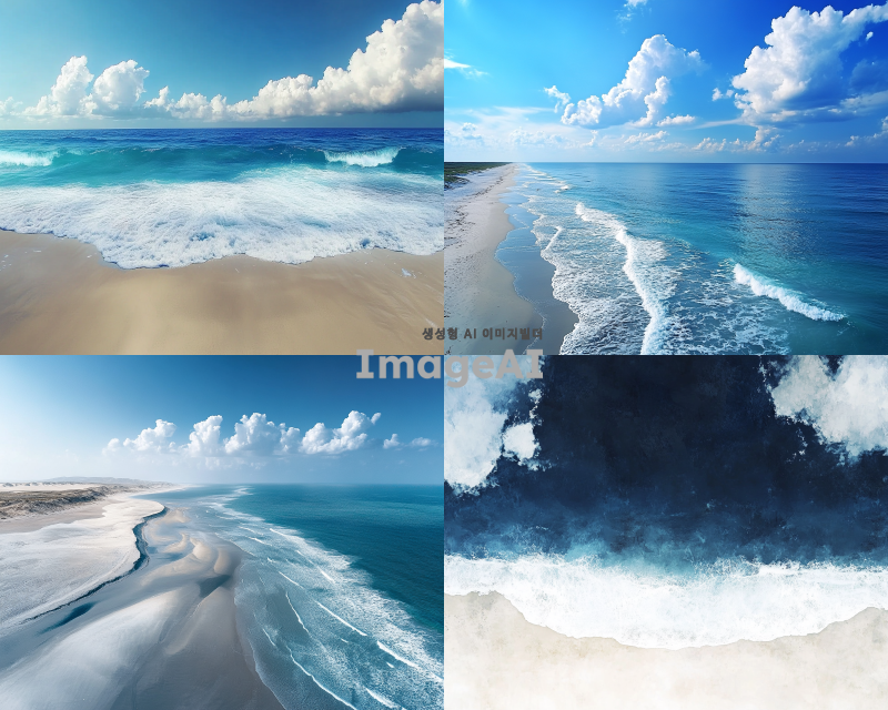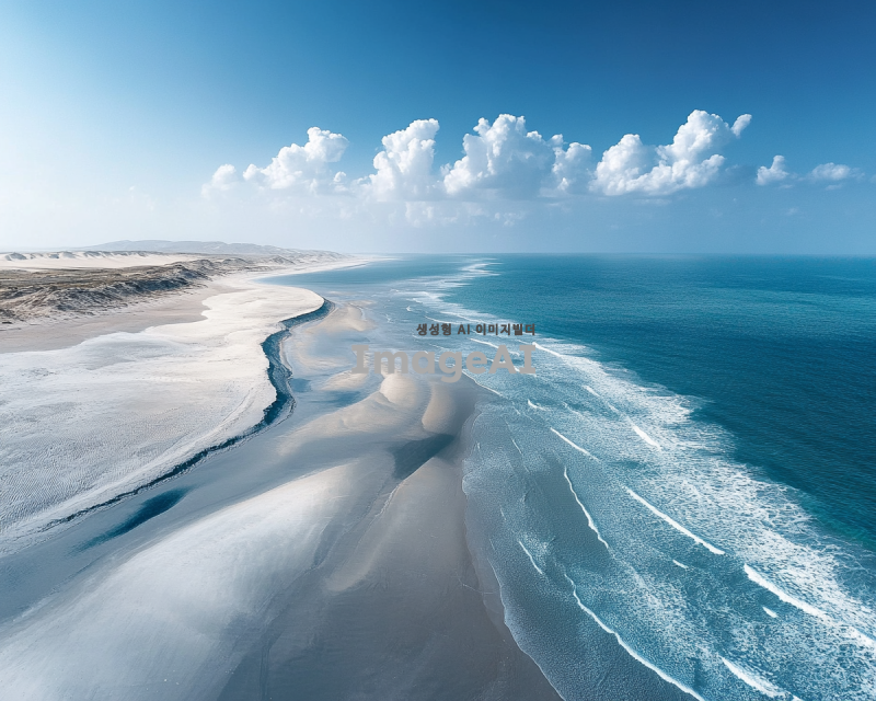 하늘에서 드론이 촬영한 듯한 시점으로, 깊고 푸른 사파이어 바다와 부드러운 하얀 백사장이 만나는 장면을 표현합니다. 하얀 파도가 잔잔하게 밀려오는 모습이 담겨 있으며, 태양의 따뜻한 빛이 바다와 백사장에 반사되어 아름다운 풍경을 만들어냅니다. 주변에는 푸른 하늘과 몇 개의 흰 구름이 떠 있어 평화로운 분위기를 자아냅니다.