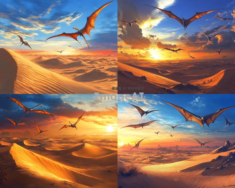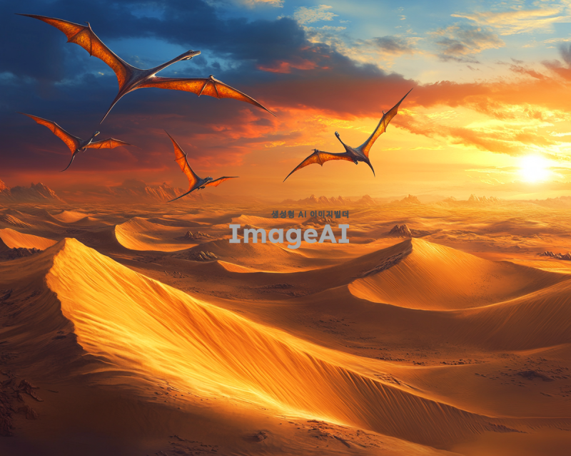 넓은 사막의 황금빛 모래 언덕이 펼쳐진 풍경, 푸른 하늘을 배경으로 하여 여러 종류의 익룡들이 자유롭게 날아다니는 모습, 태양이 저물어 붉은 노을이 지는 장면, 먼 곳에 사막의 오아시스가 보이는 신비로운 분위기, 자연의 아름다움과 생명력이 느껴지는 장면.