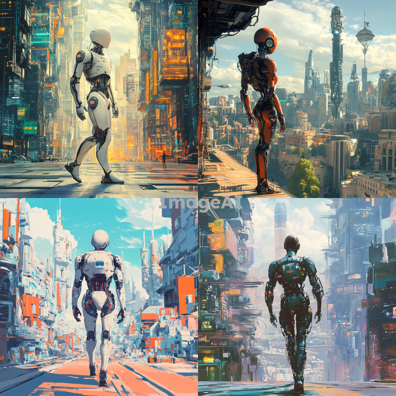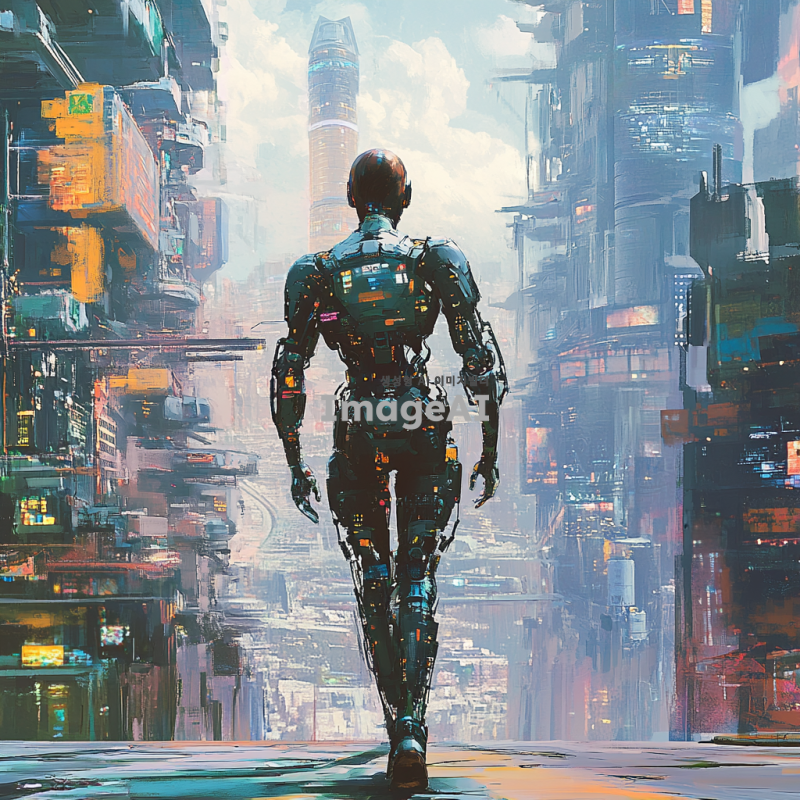 미래 도시의 거리에서 로봇 손과 로봇 다리로 대체된 사람이 걷고 있는 모습을 그려주세요. 현대적인 디자인의 로봇 팔과 다리가 자연스럽게 조화를 이루며, 사람의 표정은 자신감과 희망을 나타내고 있습니다. 배경에는 미래적인 건축물과 기술이 발전한 도시 풍경이 펼쳐져 있습니다. 밝고 생동감 있는 색감으로 미래의 긍정적인 이미지를 강조해 주세요.