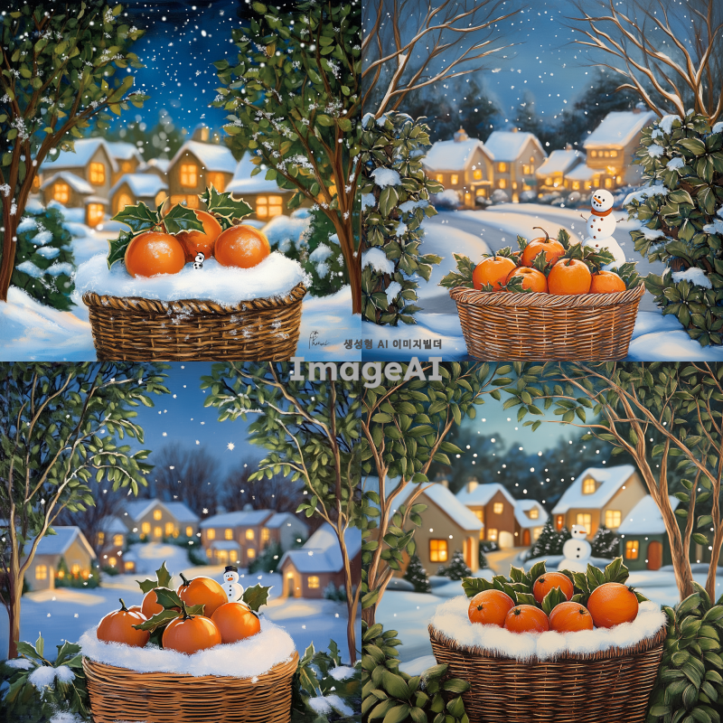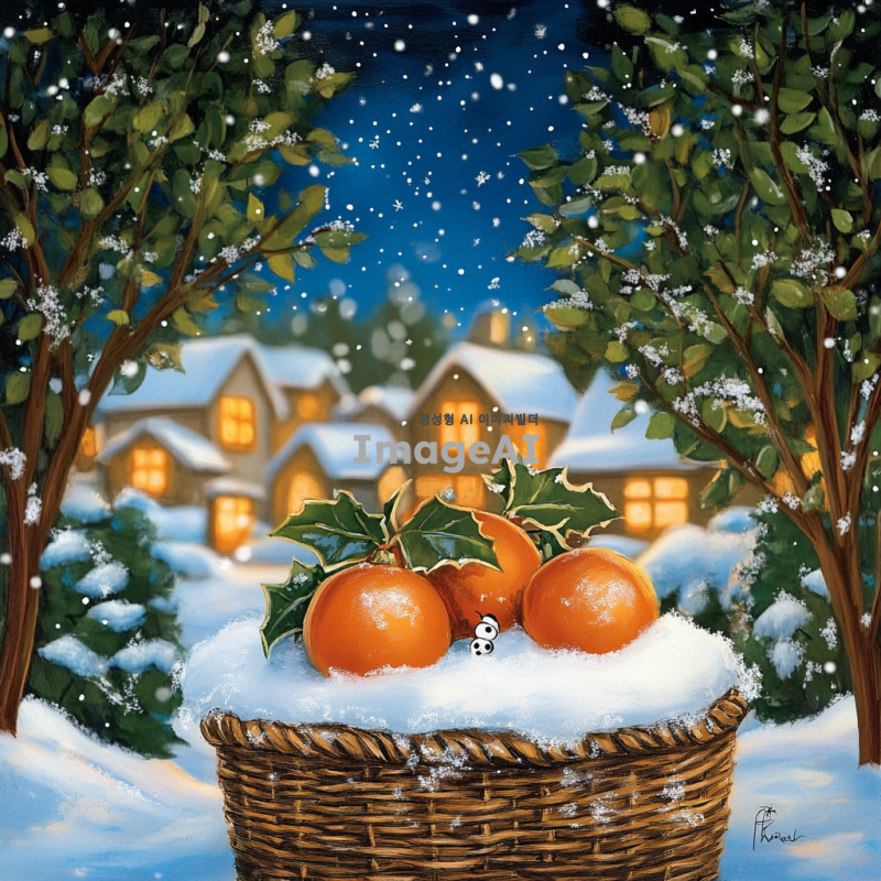 눈 덮인 풍경 속에서 따뜻한 느낌의 겨울 마을을 그려주세요. 고요한 밤하늘 아래 반짝이는 별들과, 따뜻한 불빛이 새어 나오는 아늑한 집들이 있는 장면을 담아주세요. 하얀 눈이 소복이 쌓인 나무와 길가에 서 있는 눈사람, 그리고 겨울 장식으로 꾸며진 거리의 모습도 포함해 주세요. 전체적으로 평화롭고 따뜻한 겨울의 분위기를 느낄 수 있도록 해주세요.