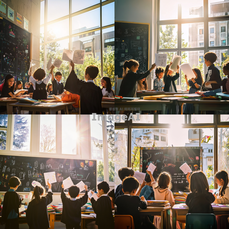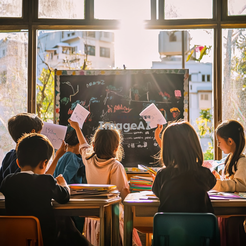 초등학교 교실의 따뜻하고 활기찬 분위기, 다양한 인종의 어린이들이 즐겁게 공부하고 있는 모습, 창문을 통해 햇빛이 들어오고, 칠판에는 알록달록한 그림과 글씨가 적혀 있는 장면, 교실 한쪽에는 책과 학용품이 가득한 책상이 놓여 있으며, 어린이들이 서로 협력하며 프로젝트를 진행하는 모습.