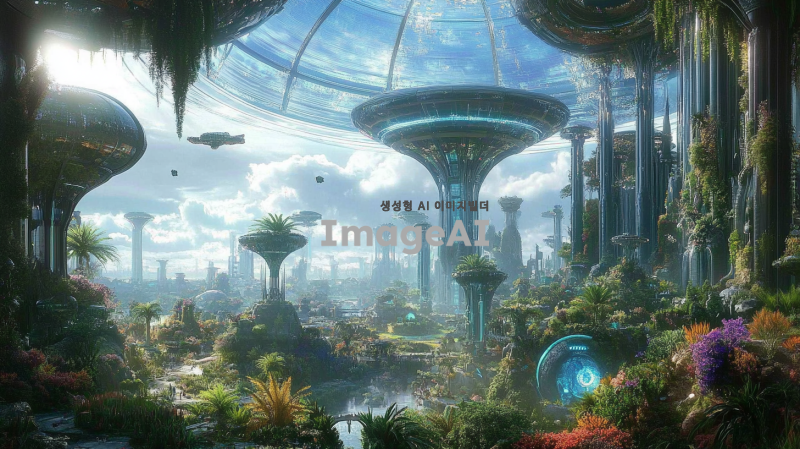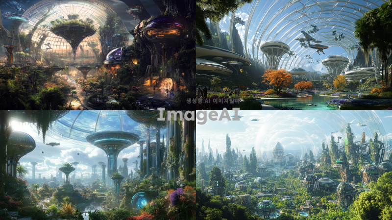 광활한 미래 도시의 풍경, 하늘을 가로지르는 반투명한 돔 아래로 다양한 색채의 식물들이 자라는 모습, 인간 대신 지구를 지배하는 새로운 생명체들은 유기적이며 기계적인 요소가 결합된 형태로, 다양한 크기와 형태를 가진다. 이 생명체들은 서로 소통하며 조화를 이루고, 그들의 사회는 자연과 기술이 융합된 모습으로 표현된다. 주변 환경은 깨끗하고 조화로우며, 생명체들은 서로 협력하여 지속 가능한 생태계를 유지한다. 미래적인 건축물들이 자연과 어우러져 있으며, 하늘에는 에너지 효율적인 비행체들이 부드럽게 날아다닌다. 이 모든 요소들이 조화를 이루며 미래의 평화로운 세상을 형성하고 있다.