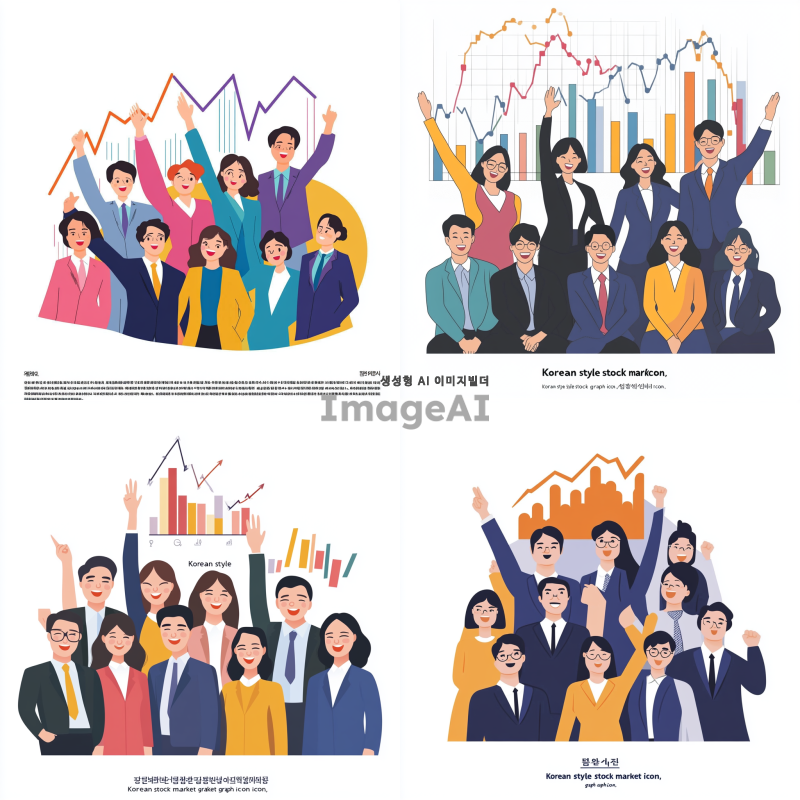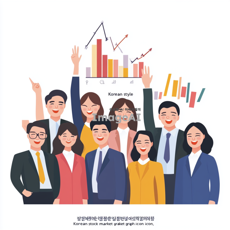 벡터 포스터 디자인, 웃고 있는 비즈니스 사람들을 특징으로 하는 평면 일러스트레이션의 그룹 사진, 모두 행복한 표정을 짓고 있으며 한 사람이 돈에 대해 이야기하는 것의 중요성을 강조하기 위해 손을 들고 있음, "한국 스타일 주식 시장 그래프 아이콘", 금융 건강 및 긍정적인 움직임에 초점을 맞춘 이벤트 또는 캠페인에 사용될 수 있음, 수트 또는 드레스 착용, 파스텔 색상 조합, 흰색 배경
