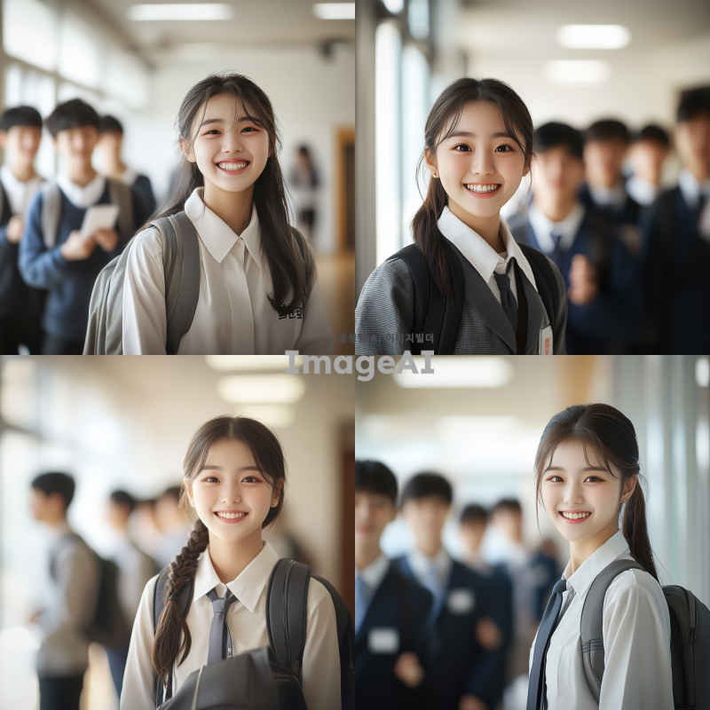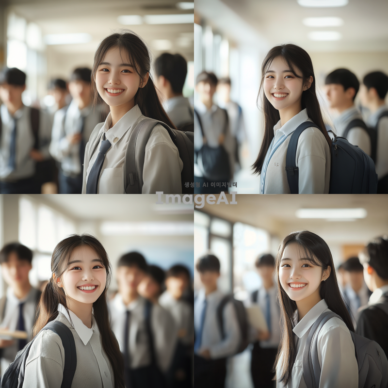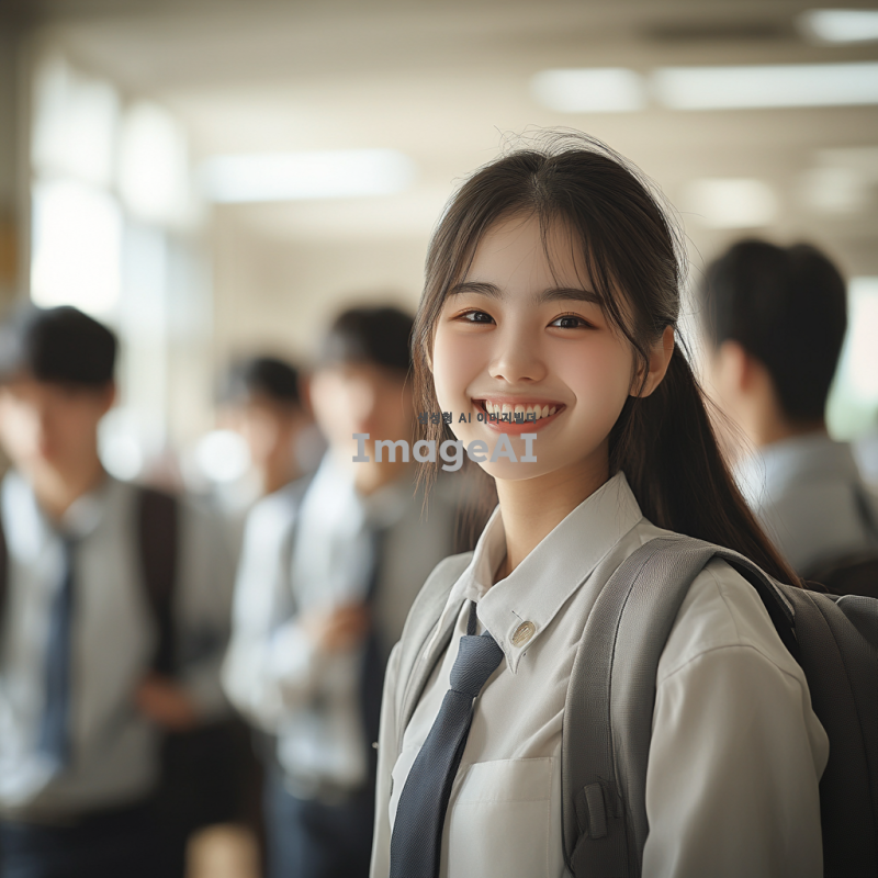한국 여고생이 환하게 웃고 있다. 흐린 배경으로 남학생들이 있다. 사실적. 영화적 분위기.